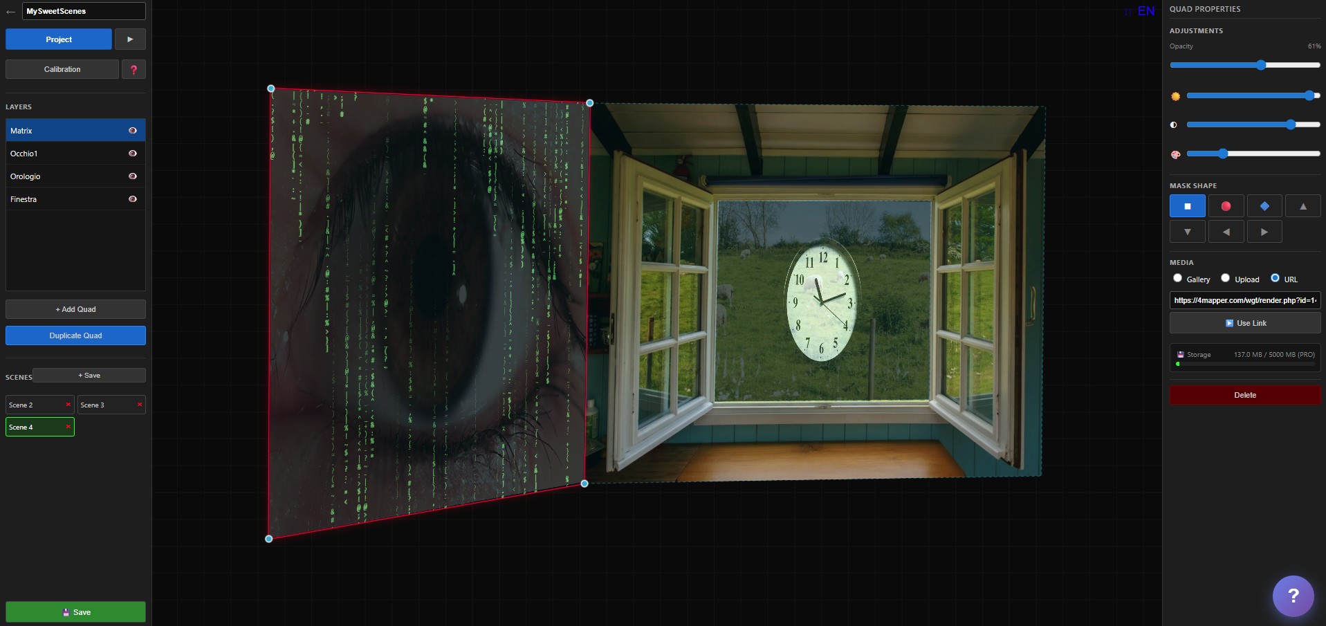 4mapper is a web-based projection mapping tool for visual artists, VJs, and performers. • 100% browser-based - no installation needed • Intuitive perspective correction with corner points • Multi-scene support for live performances • Supports images, videos (MP4, WebM), GIFs • Real-time preview and editing Perfect for live VJ shows, art installations, theater productions, and architectural projections. An accessible alternative to MadMapper or Resolume that runs in your browser.