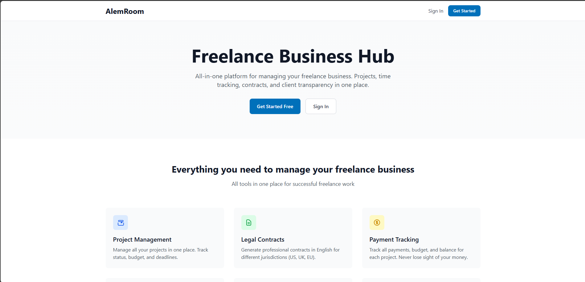 AlemRoom is a business hub designed specifically for freelancers. The platform provides simple, essential tools to help you navigate and avoid common legal and payment challenges that often arise during independent work. By using this hub, you can better manage your freelance professional life and ensure your business operations remain secure and efficient.