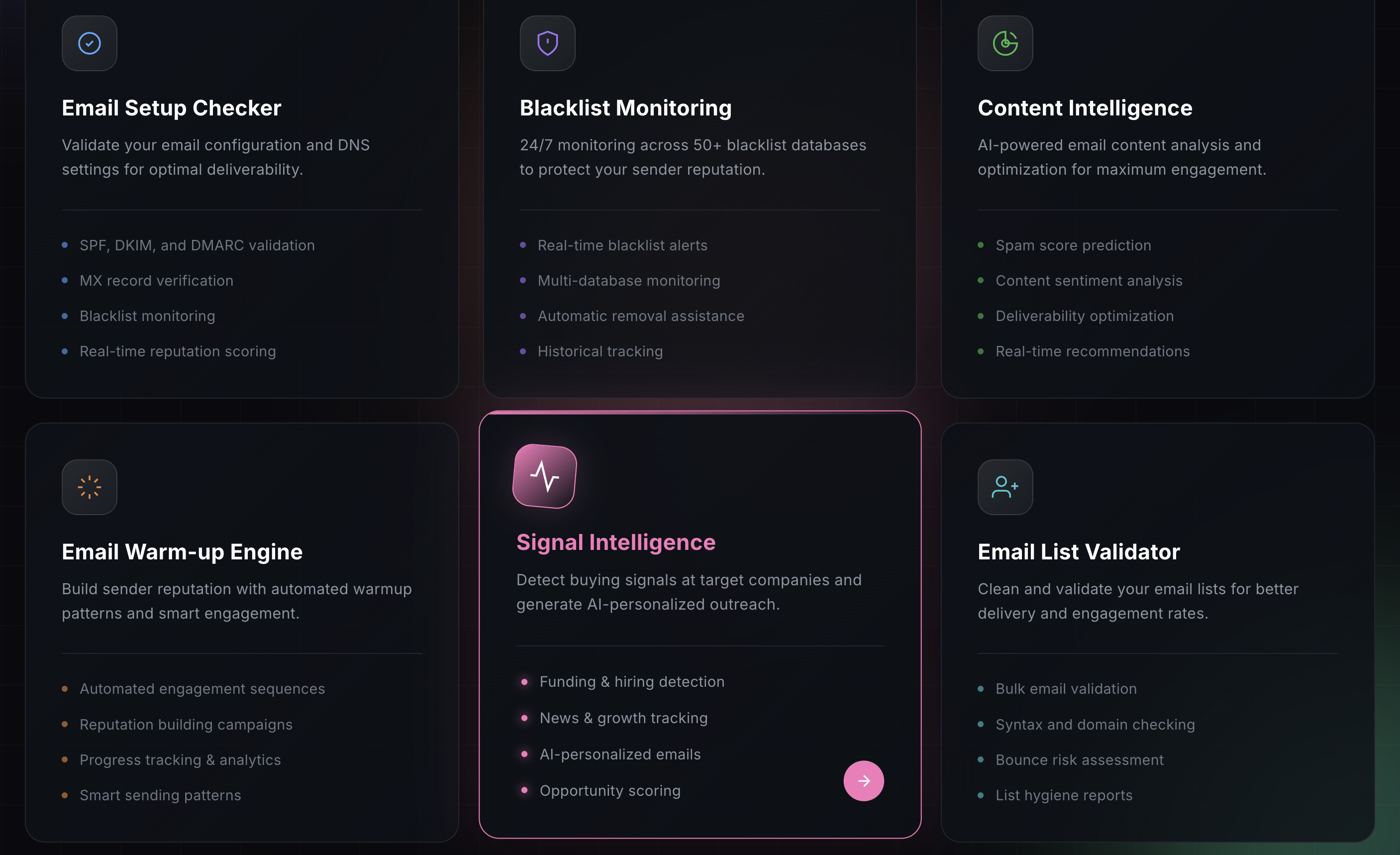 We built this after juggling 5+ outreach tools that didn’t talk to each other. Now everything lives under one roof, plus Signal Intelligence to time emails perfectly. Getting you more booked meetings.