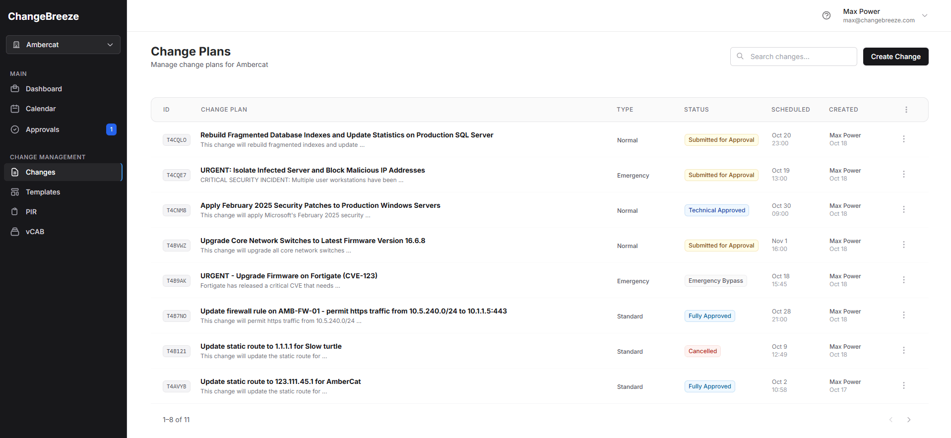 ChangeBreeze is a modern, ITIL-compliant change management platform specifically built for Managed Service Providers (MSPs). It streamlines the transition from messy spreadsheets to a professional, multi-tenant system that handles Standard, Normal, and Emergency changes with built-in approval workflows. Designed to reduce client outages and simplify compliance, it offers a centralized change calendar, automated audit trails, and client-specific dashboards to ensure stability and transparency.