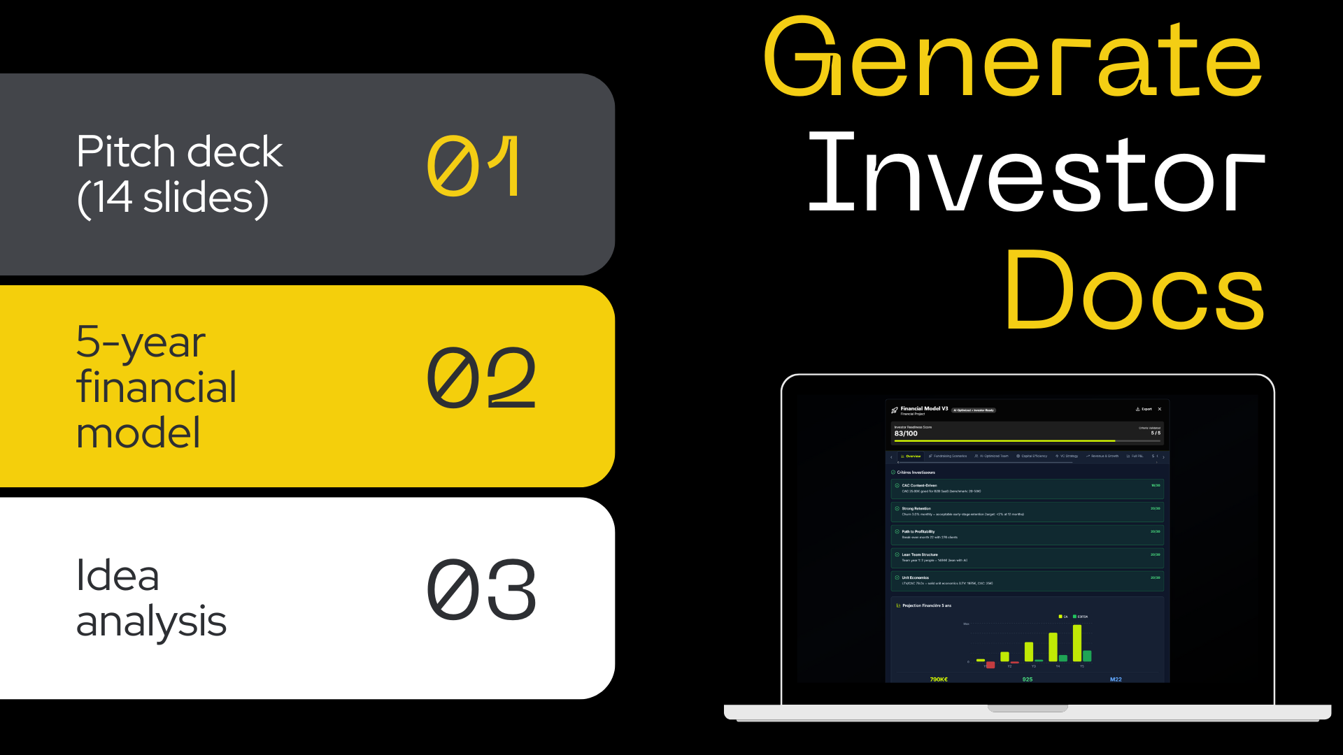 CharliA is an AI that helps founders go from a raw idea to a complete investor-ready package. Generate your pitch deck, business plan, financial model, and PMF validation to structure your fundraising in just 48 hours.