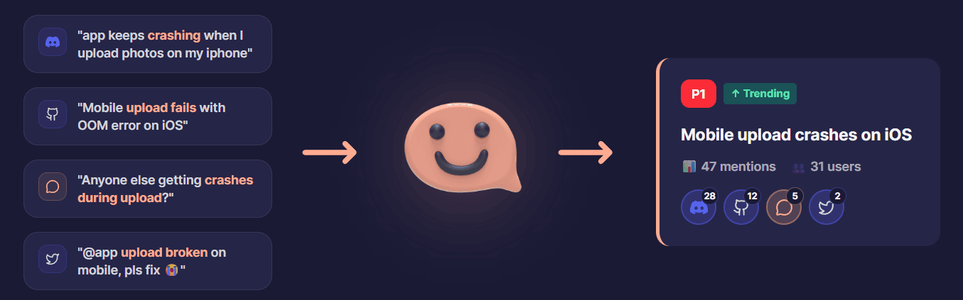 Instead of copying feedback into a spreadsheet and trying to remember if you've seen this complaint before, Chatter Plus does that automatically. It Pulls from Discord, GitHub, forums, support tickets