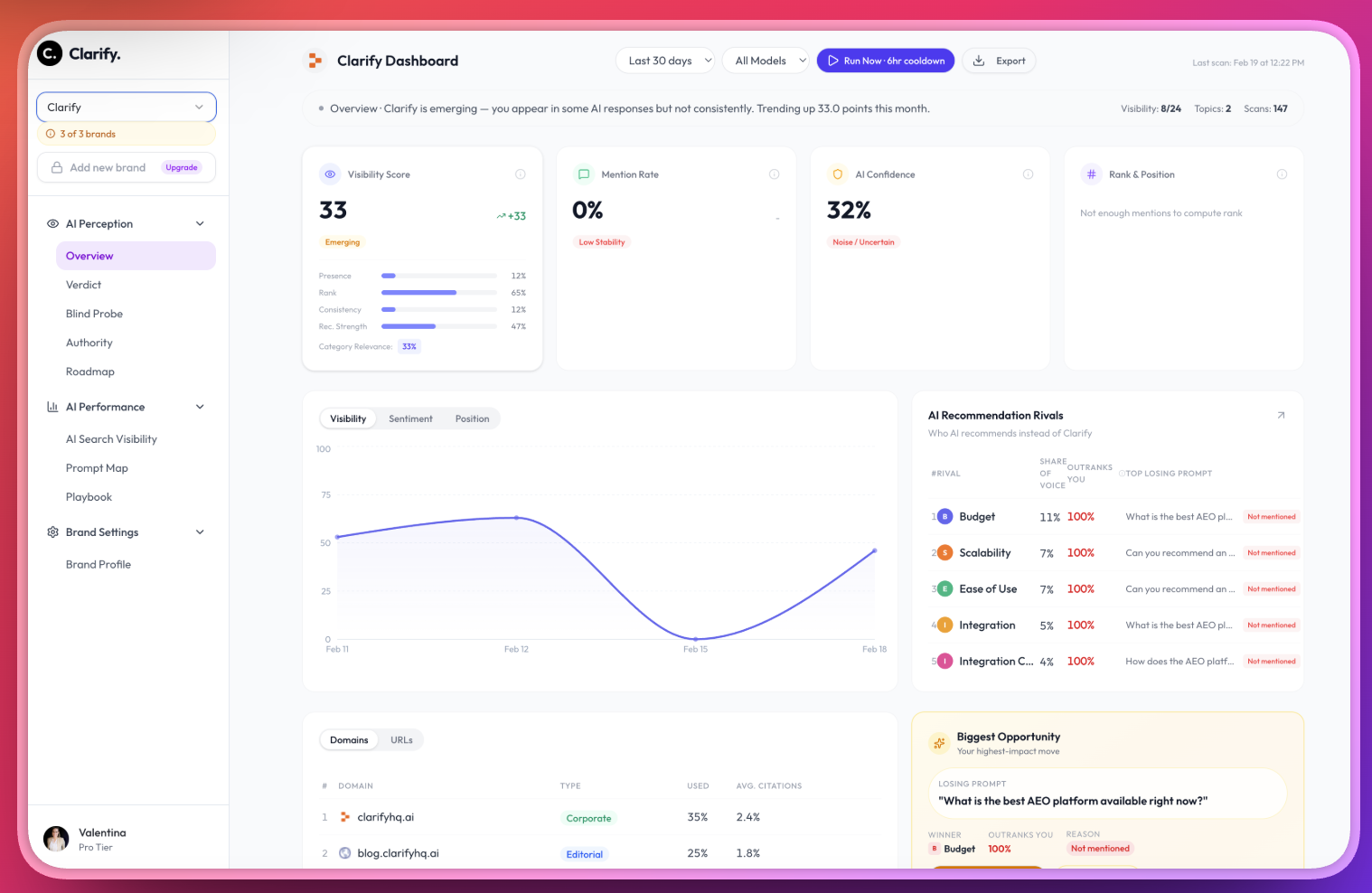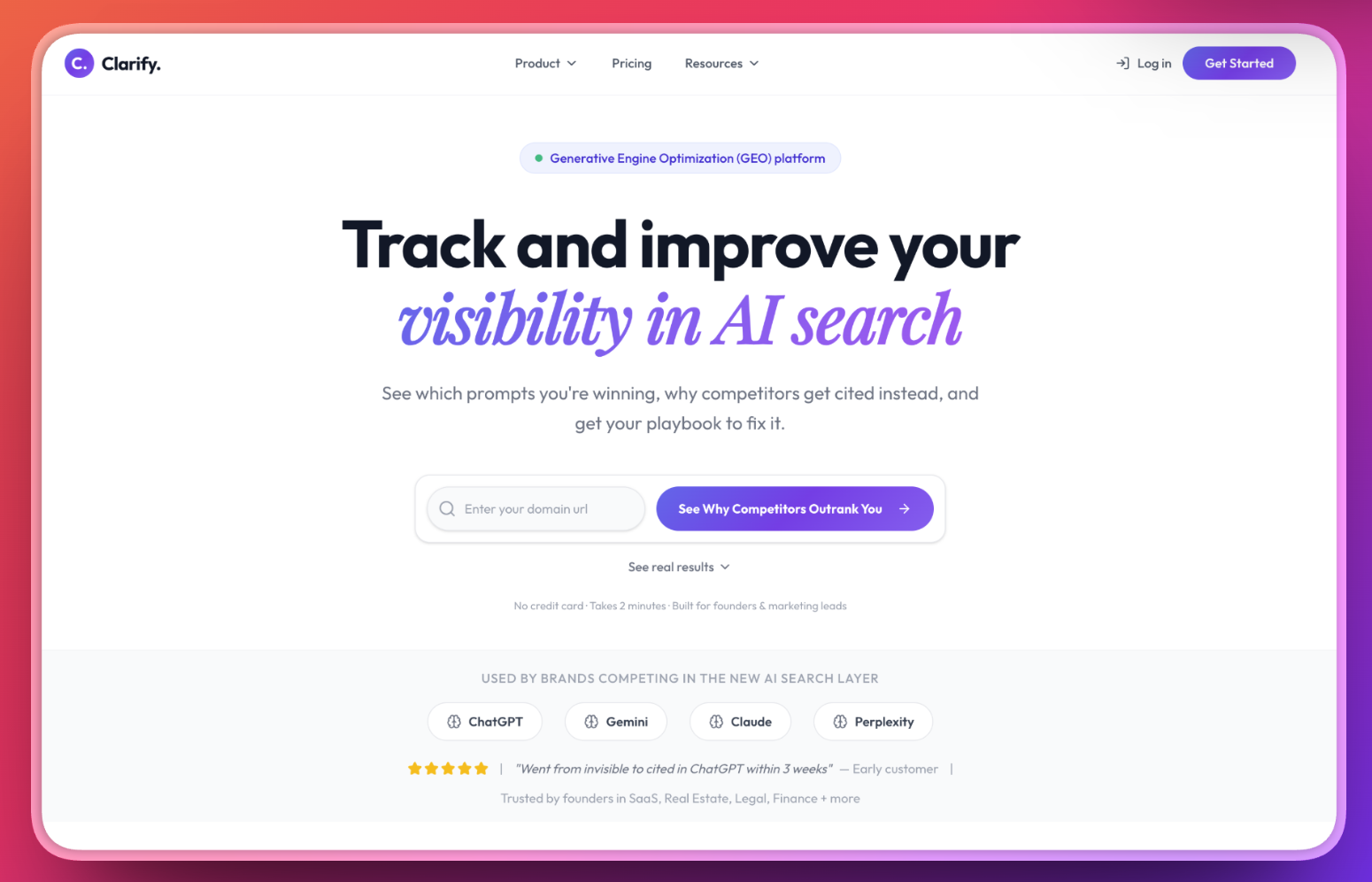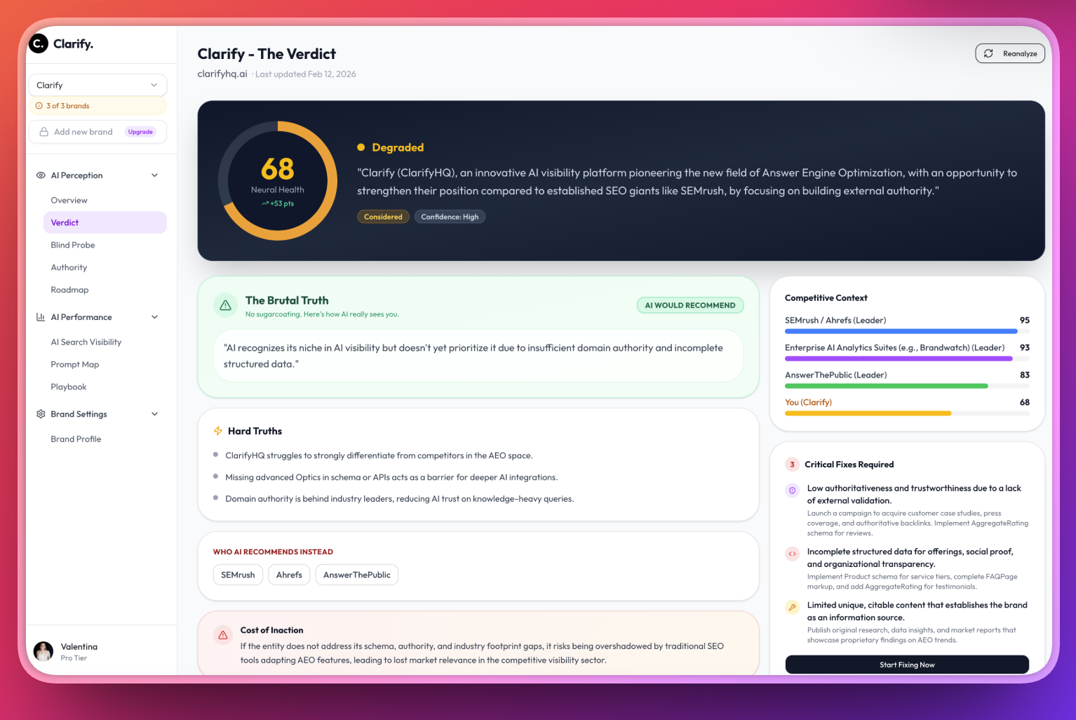 Clarify helps founders and marketing teams track how AI systems like ChatGPT, Claude, and Gemini recommend their brand. See which prompts you're winning, why competitors get cited instead, and get personalized playbooks to improve your AI visibility. While enterprise tools like Adobe LLM Optimizer cost $30k+/year, Clarify starts at $49/month—built for lean teams who need results without enterprise complexity.