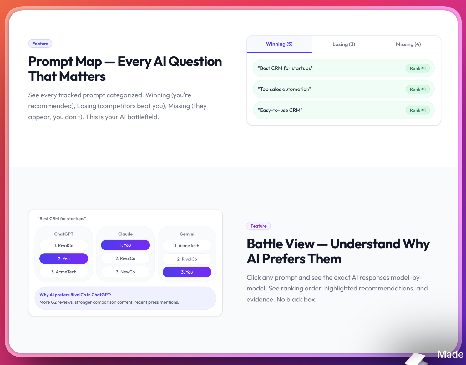 Excited to launch! I built this after realizing ChatGPT never recommended us despite ranking #1 on Google. Most founders have no idea this is happening. Happy to answer questions!