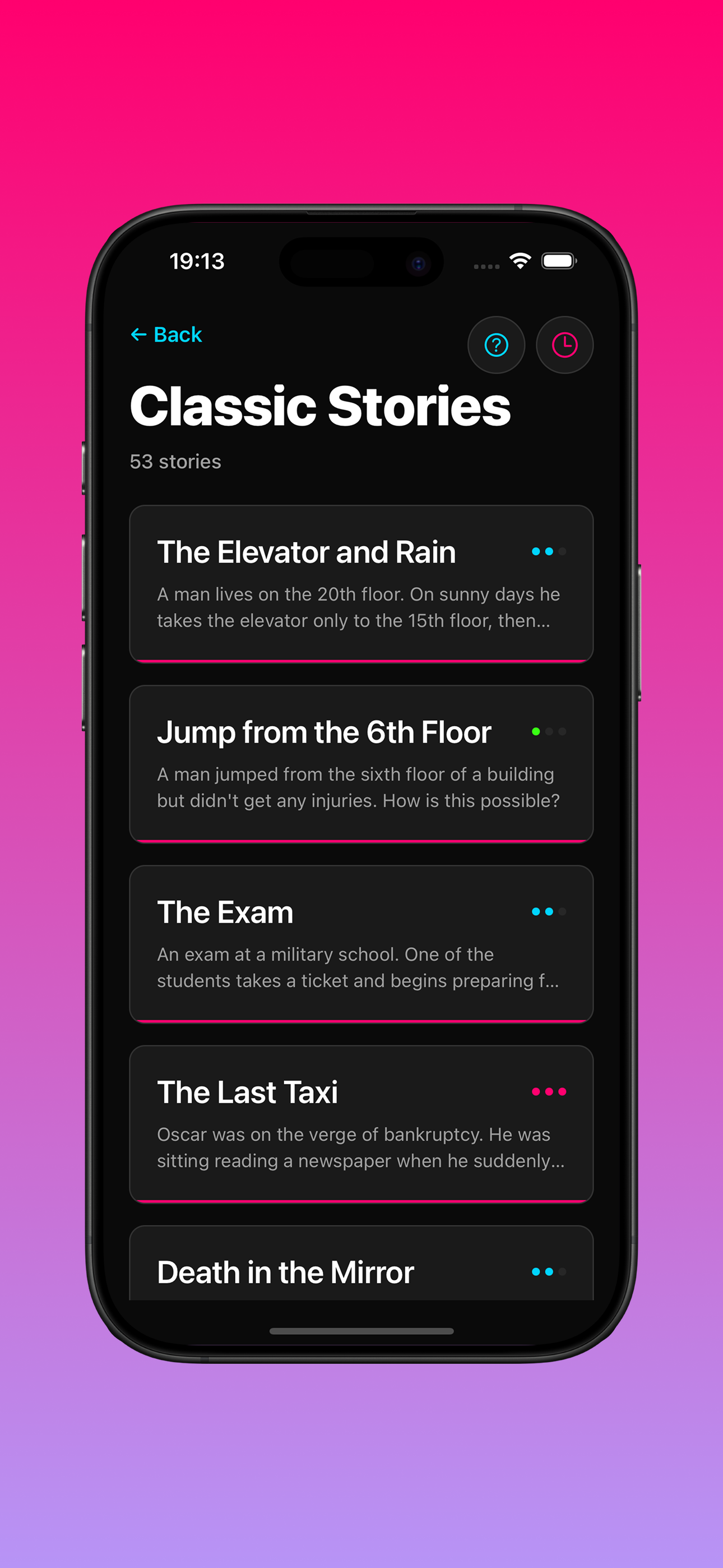 Dark Stories: Detective is the ultimate lateral thinking puzzle game designed to break the ice at any party or challenge your brain in solo mode. How it works: One player (the narrator) reads a short, mysterious story. The others (detectives) must ask questions to uncover the truth. The catch? The narrator can only answer "Yes", "No", or "Irrelevant". Key Features: Party Mode: Perfect icebreaker for groups. No complex rules, just pure mystery. Solo Mode with AI: Powered by Gemini AI. You don't need a group to play - the AI acts as the narrator, answering your questions with high accuracy. Diverse Categories: From classic crime mysteries to historical facts. Multilingual: Available in English, Spanish, and more. Available now on iOS and Android. Can you solve the mystery?