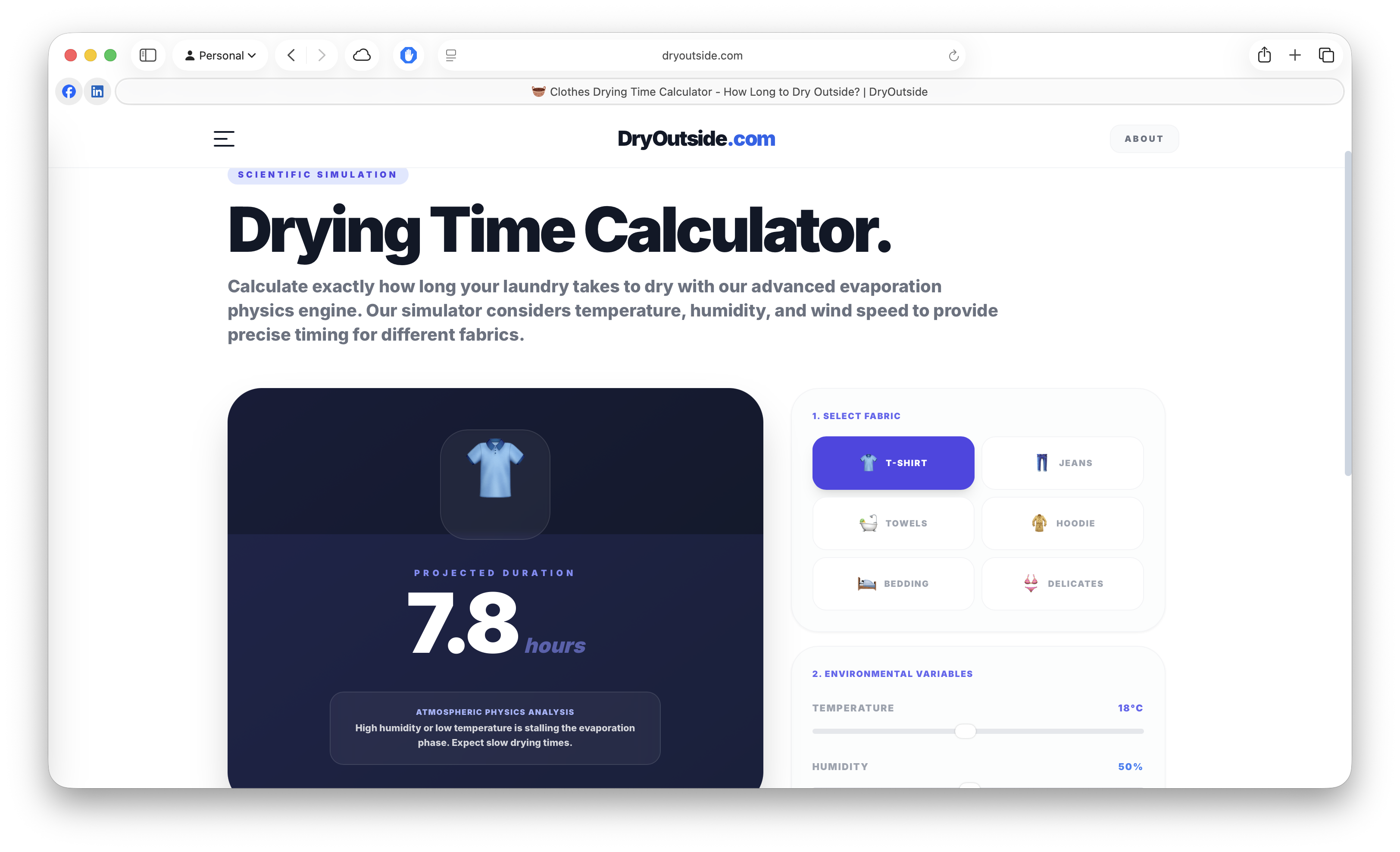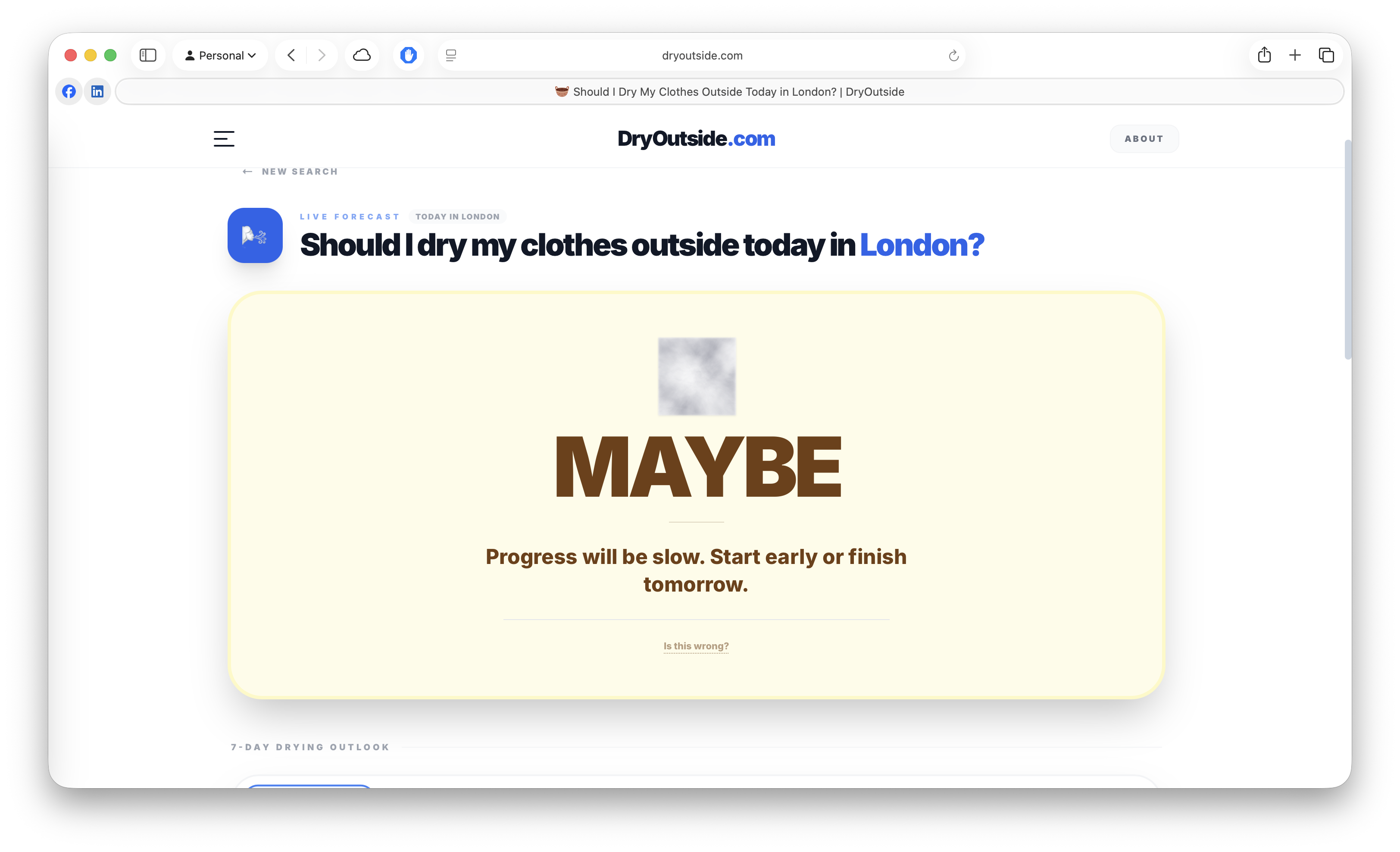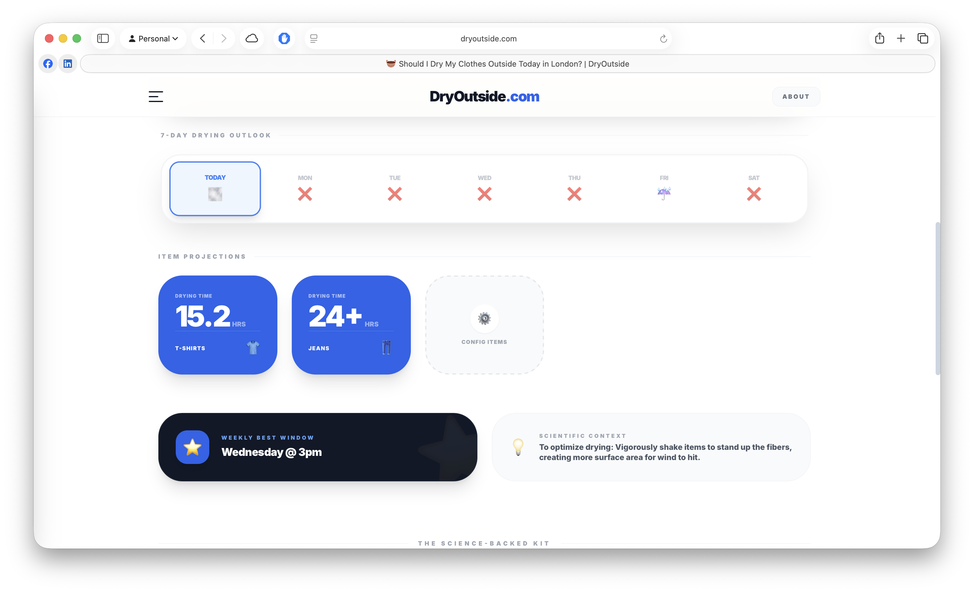 I built DryOutside.com to cut energy bills. Unlike basic weather apps, it uses humidity and wind data to tell you if clothes will actually dry. Includes indoor tips and a weekly outlook.