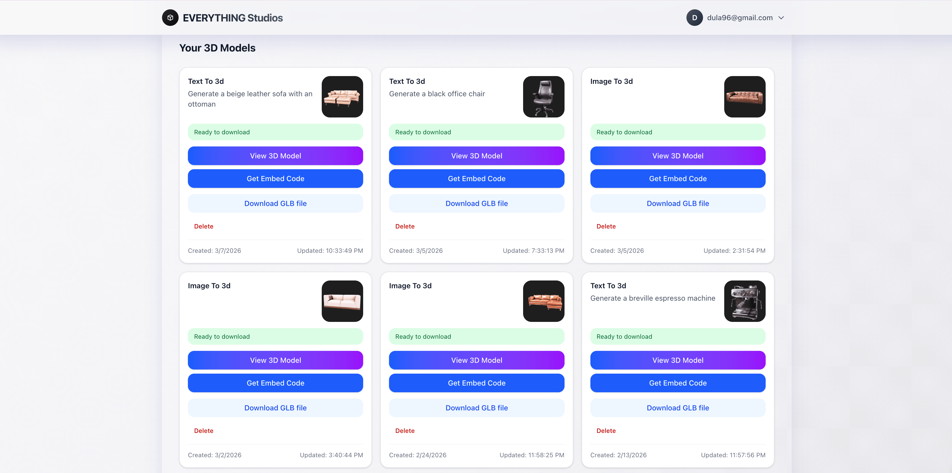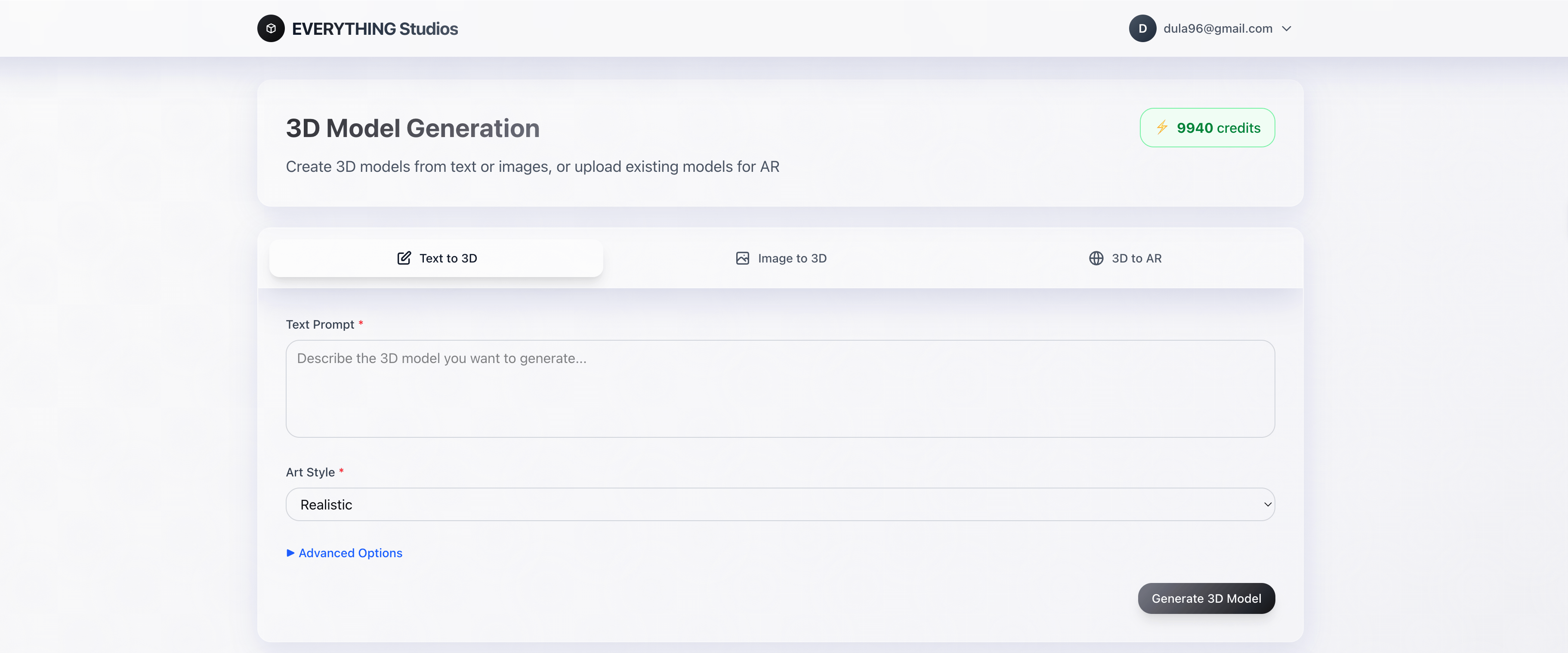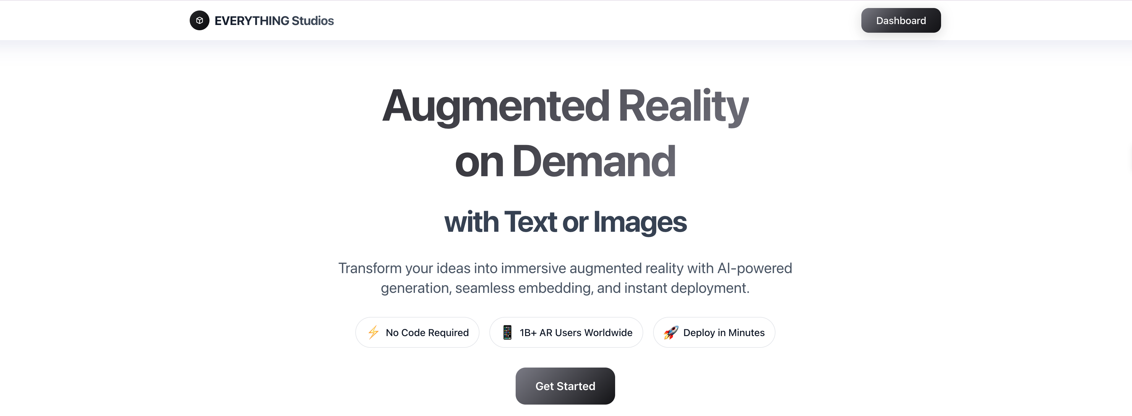 EVERYTHING Studios is an AI-powered WebAR platform that helps brands create, deploy, and scale immersive 3D & Augmented Reality experiences instantly. We enable brands, creators, and agencies to generate lightweight AR experiences directly from text or images, without 3D artists, native apps, or complex workflows. Our platform turns prompts into optimized, embeddable WebAR assets that work seamlessly across iOS, Android, and the web. Born from years of hands-on experimentation in fashion and experiential storytelling, EVERYTHING Studios bridges creativity and infrastructure, making AR practical, accessible, and performance-driven. From product visualization and interactive commerce to events, education, and storytelling, we’re building the AR layer for the modern internet. Prompt → Publish → Embed. That’s it.