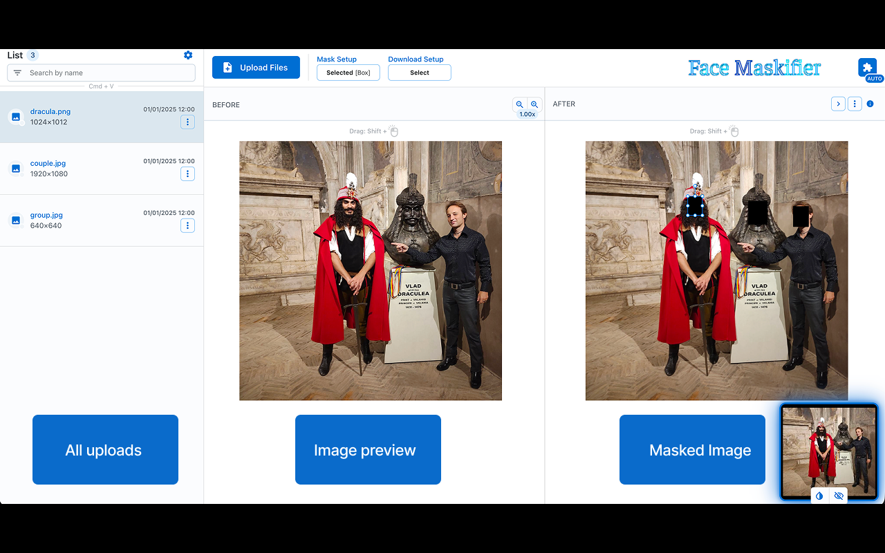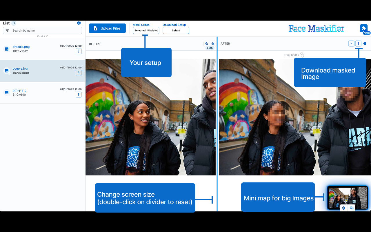 Maskify face on image Face Maskifier improves your workflow by applying customizable masks on detected face in images, and enabling secure downloads, ensuring your data stays private and offline. Features: • ⚡ Performance: quickly detects faces in image without delays(file not sent to internet). • 🎯 Precision: delivers highly accurate results. • 🔒 Offline Functionality: operates entirely offline, ensuring your data stays private. • 🎨 Edit: you can delete, move and rotate mask. • ✨ Extra Options: output size control, watermarking (image/signature), metadata handling, and format selection. Shortcuts: • Paste files from your clipboard for processing: Ctrl/Cmd + V • Copy the modified selection to your clipboard: Ctrl/Cmd + Shift + C Note: compatibility may vary across devices 😢.