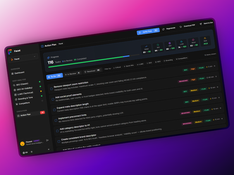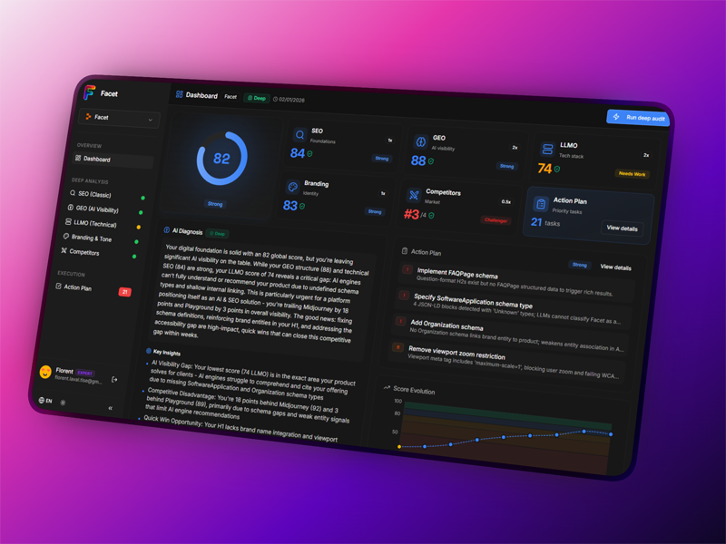Hi PeerPush! 👋 I'm Florent. I couldn't find a decent audit tool, so I built Facet. It analyzes SEO, GEO/AEO, LLMO and Branding to help you convert better. 🚀 I need feedback, roast my landing page!🙏