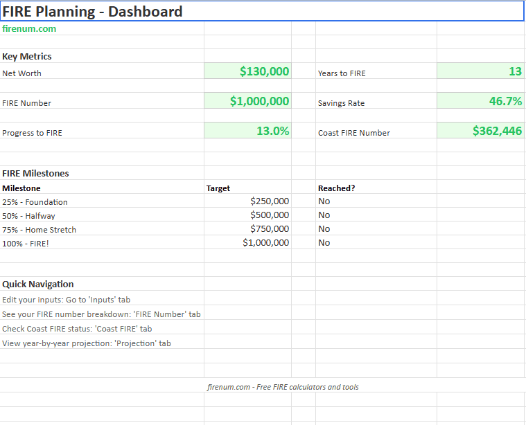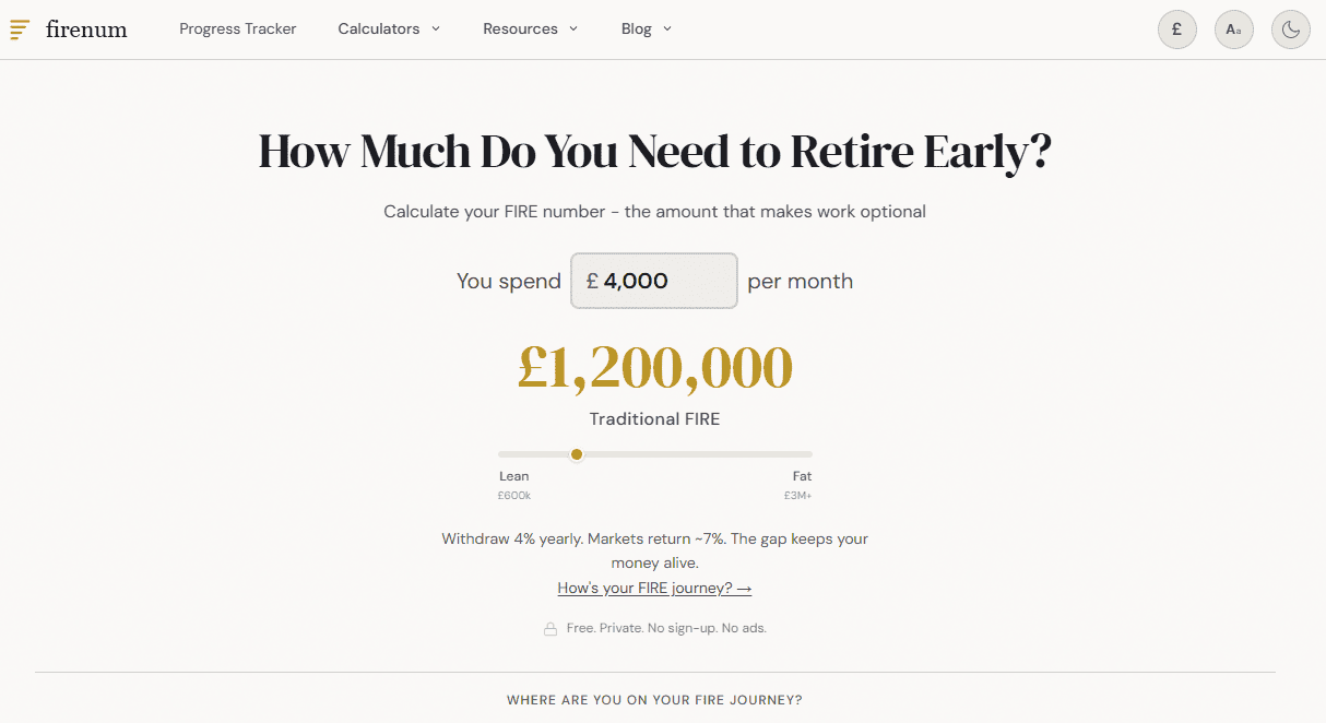 Firenum is a free FIRE calculator suite designed to help you plan your early retirement with confidence. Calculate your FIRE number, Coast FIRE, Lean/Fat/Barista FIRE, project retirement dates, and track your net worth using the Progress Tracker. Visualize your journey towards financial independence on a comprehensive dashboard. Model market crash scenarios and other financial events. Supports 8 currencies. No signup required; 100% private as data never leaves your browser. Visit https://firenum.com/ for more information.
