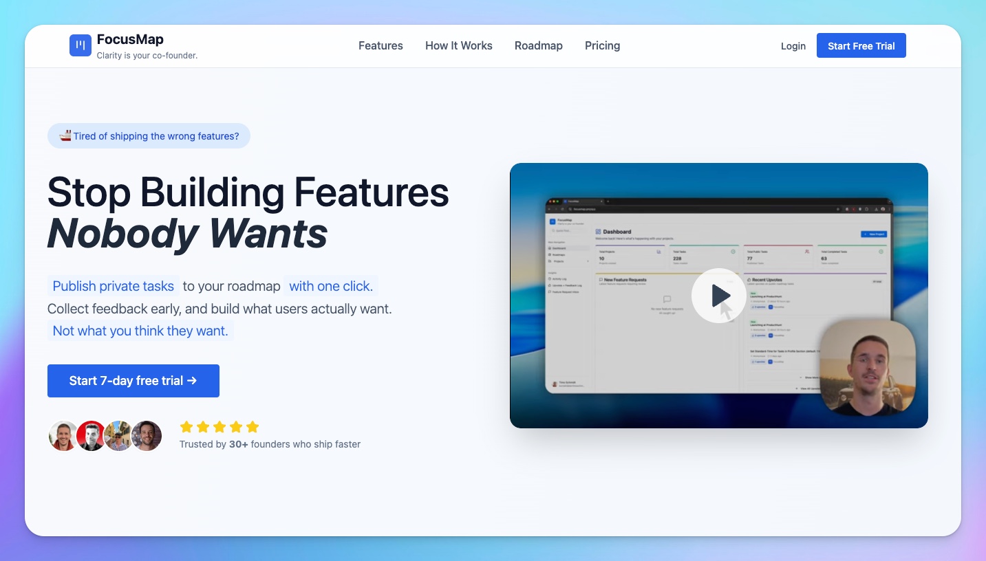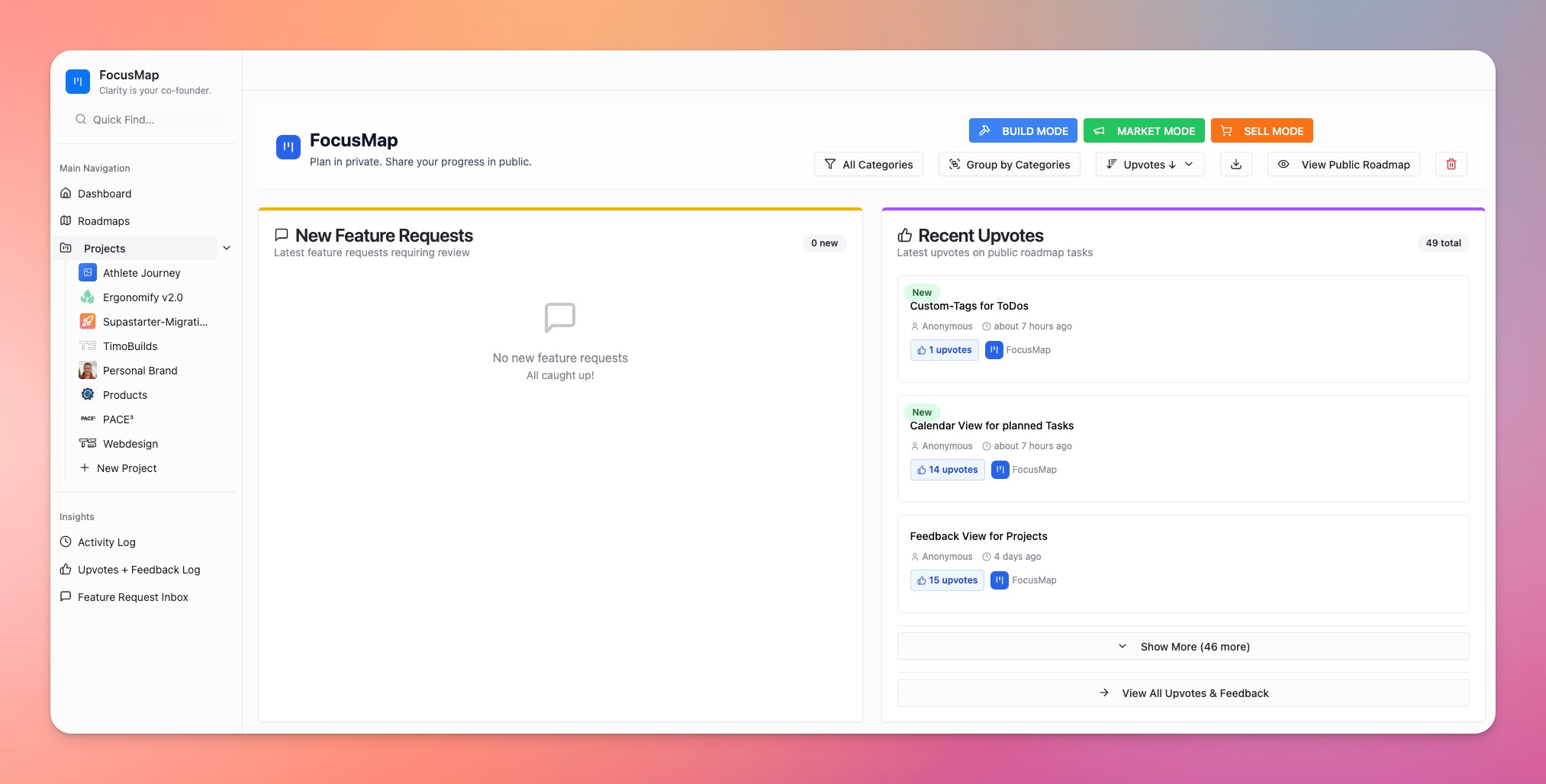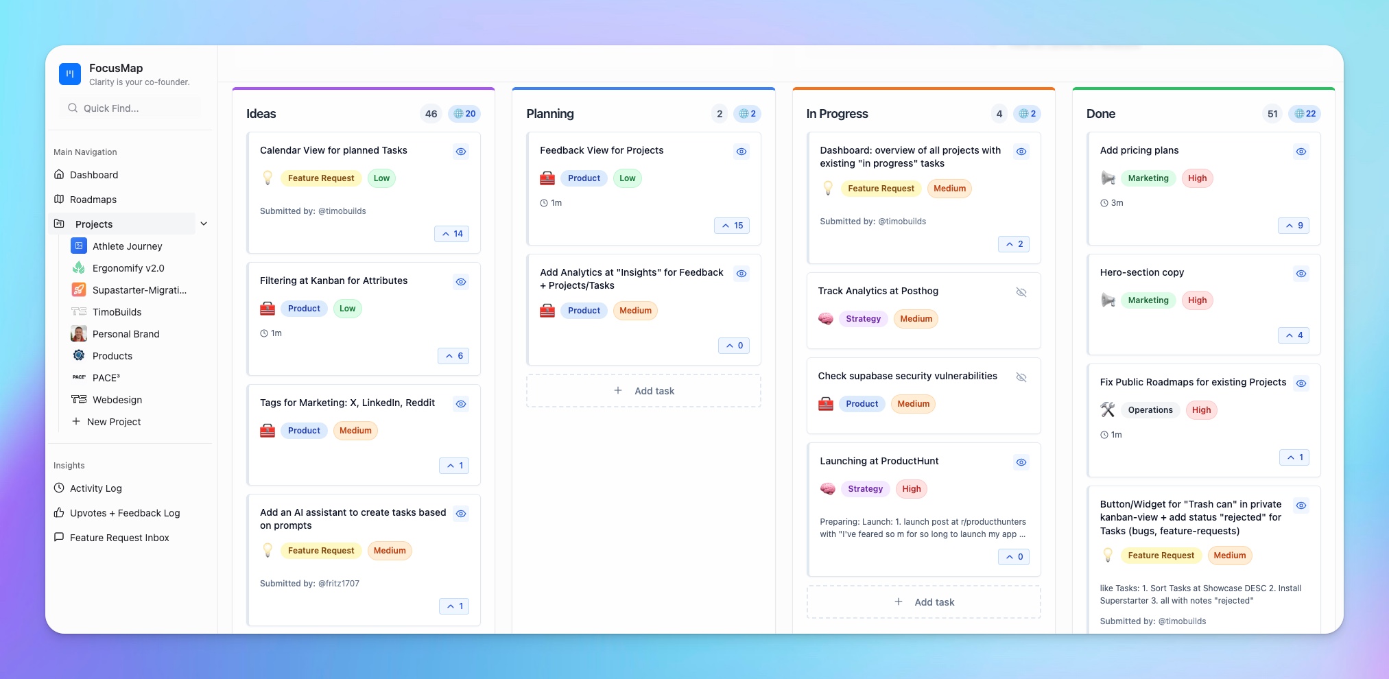Focusmap helps you publish selected tasks to get real feedback so you can focus your energy on what actually grows your product. You can collect early insights from other founders and users, ensuring