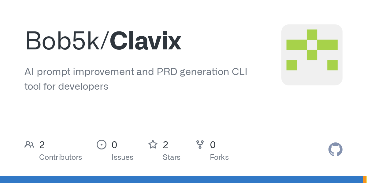 Clavix is a command-line interface (CLI) tool designed for developers, focusing on enhancing AI prompts and generating Product Requirement Documents (PRDs). This tool helps streamline the creation of high-quality prompts for AI models and facilitates the development process by assisting with PRD generation.