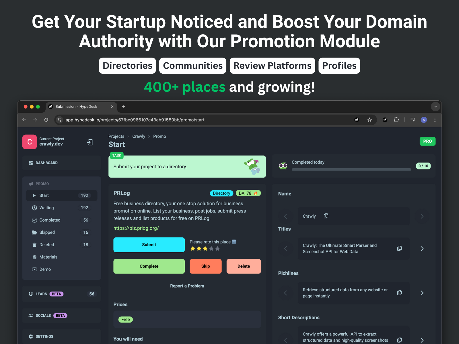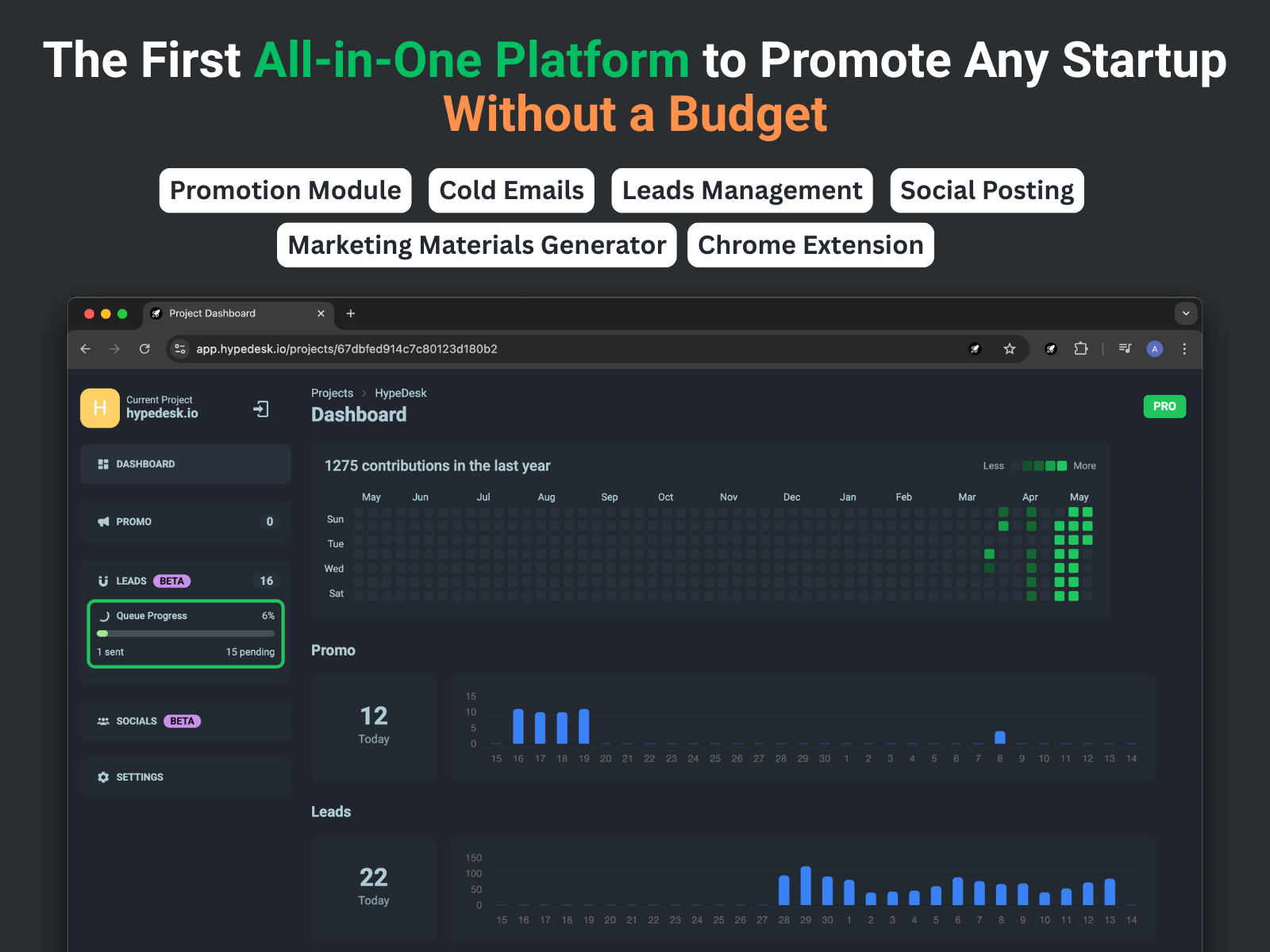 HypeDesk is your all-in-one, AI-powered marketing platform designed for indie developers and early-stage startups to grow with zero marketing budget. Instantly generate on-brand marketing content, promote your project in over 400 curated directories and communities, manage leads, send AI-personalized cold emails, and schedule social posts—all from one centralized hub.