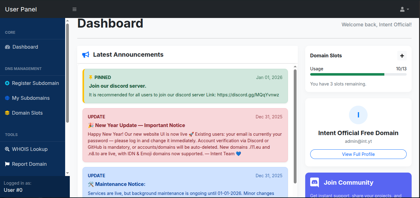 Intent FreeDomain allows you to get a free .int.yt, .i11.eu, and .n8.to subdomain in seconds. This service simplifies your web presence by offering instant DNS updates and automatic HTTPS without any hidden fees. You can quickly set up your project's online identity using these professional and accessible subdomains, ensuring your site is secure and reachable immediately.