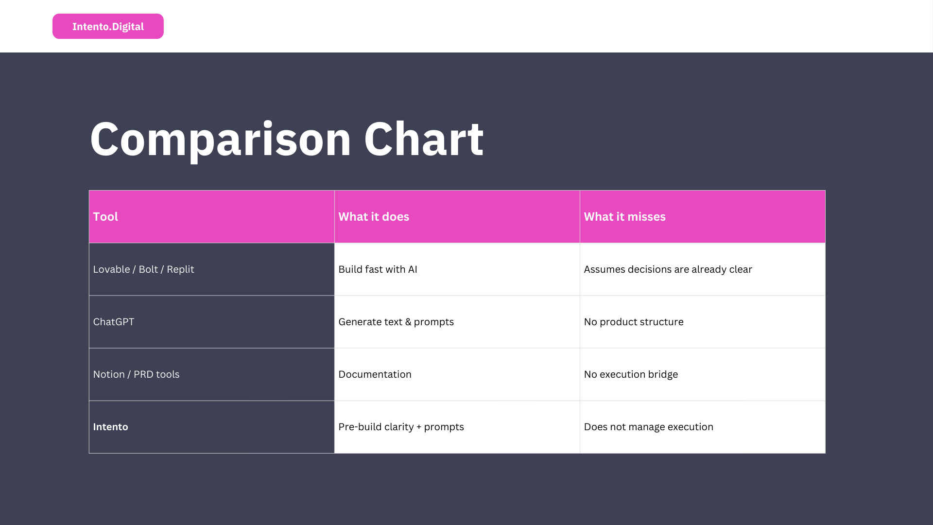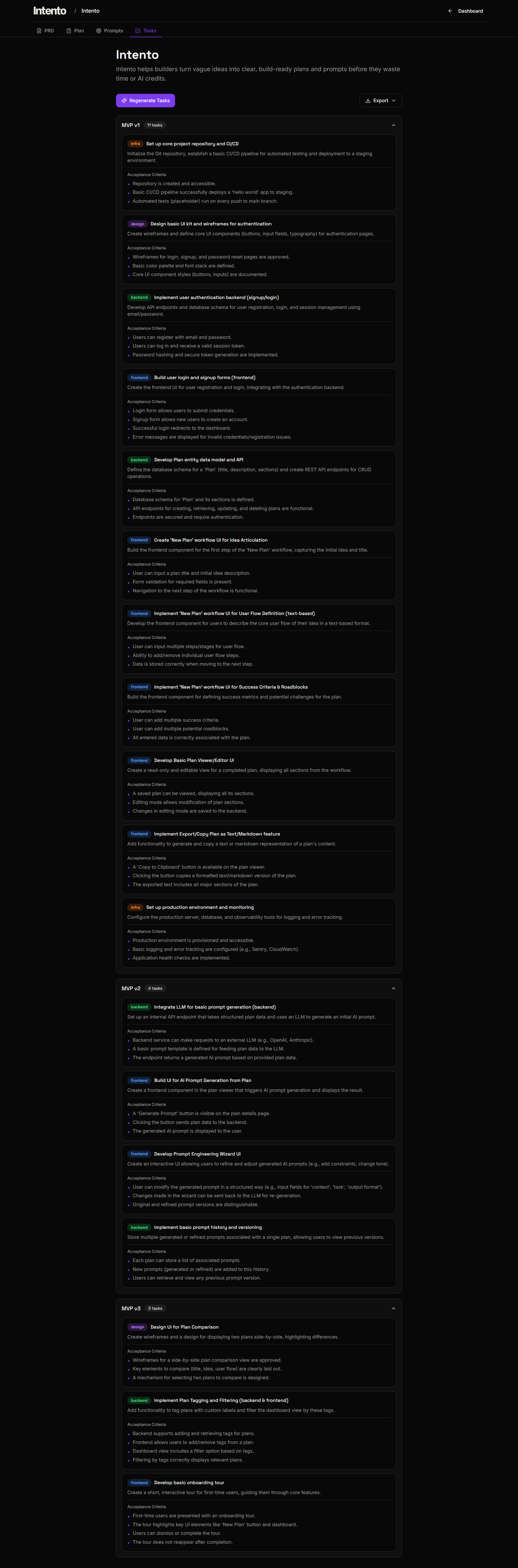 Launching Intento today 🚀 Intento helps founders and builders turn rough ideas into clear PRDs, MVP plans, and build-ready AI prompts before they start coding. If you are using AI tools to build pr