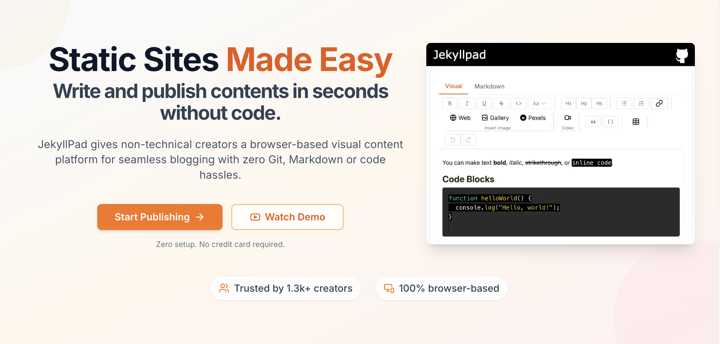 Static Sites Made Easy. Zero Markdown or Code.