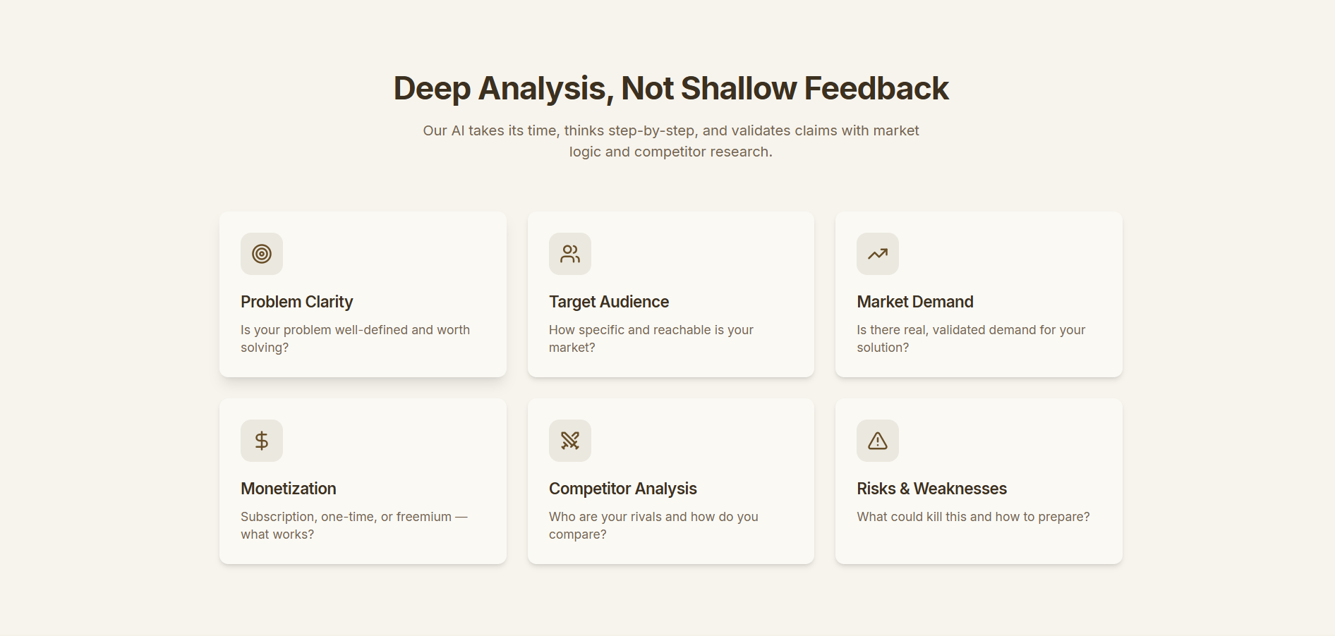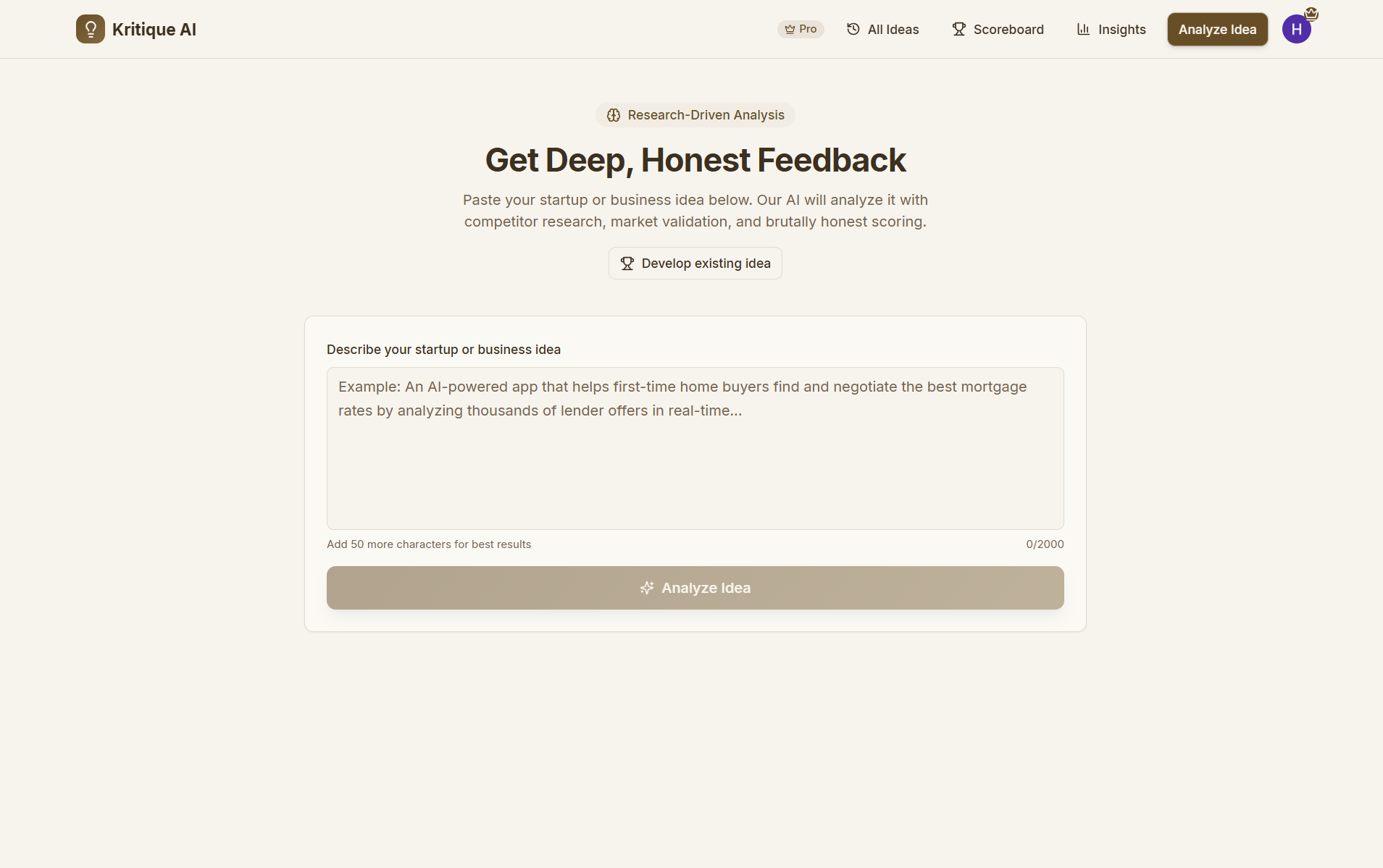 Get deep, research-driven AI analysis of your start-up ideas. Brutally honest feedback with competitor analysis, market viability, and actionable improvements.