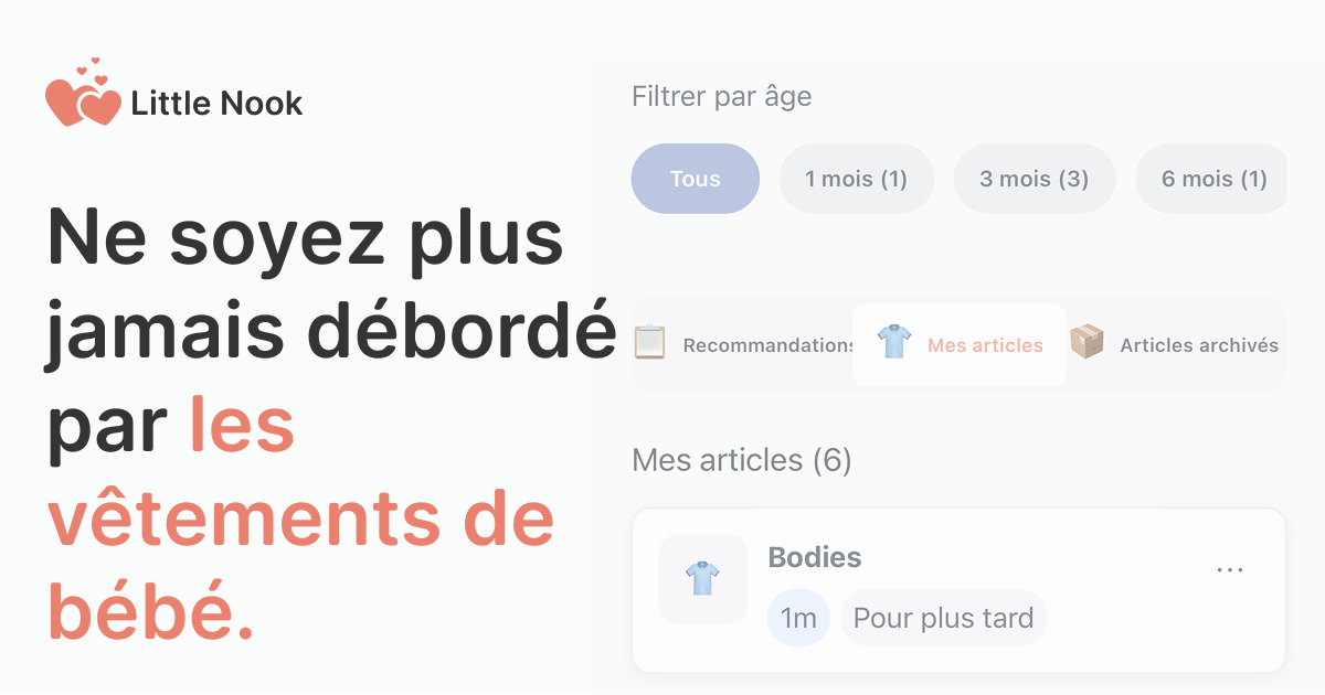 Little Nook helps you manage your baby's wardrobe inventory with ease. You can track clothes, anticipate upcoming sizes, and avoid buying duplicates. This tool is designed to help you stay organized a