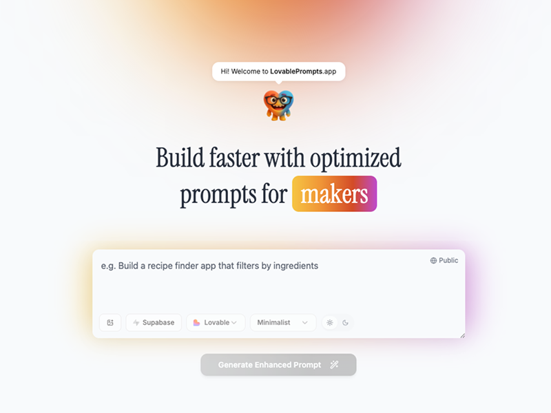 LovablePrompts.app helps founders, designers, and product builders turn a rough idea into a clear, build ready prompt for vibe coding tools like Lovable, Bolt, Replit, V0 or Cursor. The first prompt matters more than people think: it sets the scope, UX, data model, edge cases, and a clear success criteria, saving hours of back-and-forth and prevent messy rebuilds later. Instead of starting from a blank page, you start with a structured prompt that follows best practices and is easier to iterate on. Beyond the initial prompt, the platform includes Smart Prompts, a library of ready-to-use prompts to quickly add common features, integrations, and improvements, and Custom Features, where you describe a specific capability you want and get an a custom prompt tailored to your product and current build stage. It also suggests new feature ideas based on your concept, so you can expand your roadmap with practical enhancements and copy-paste prompts to implement them fast.