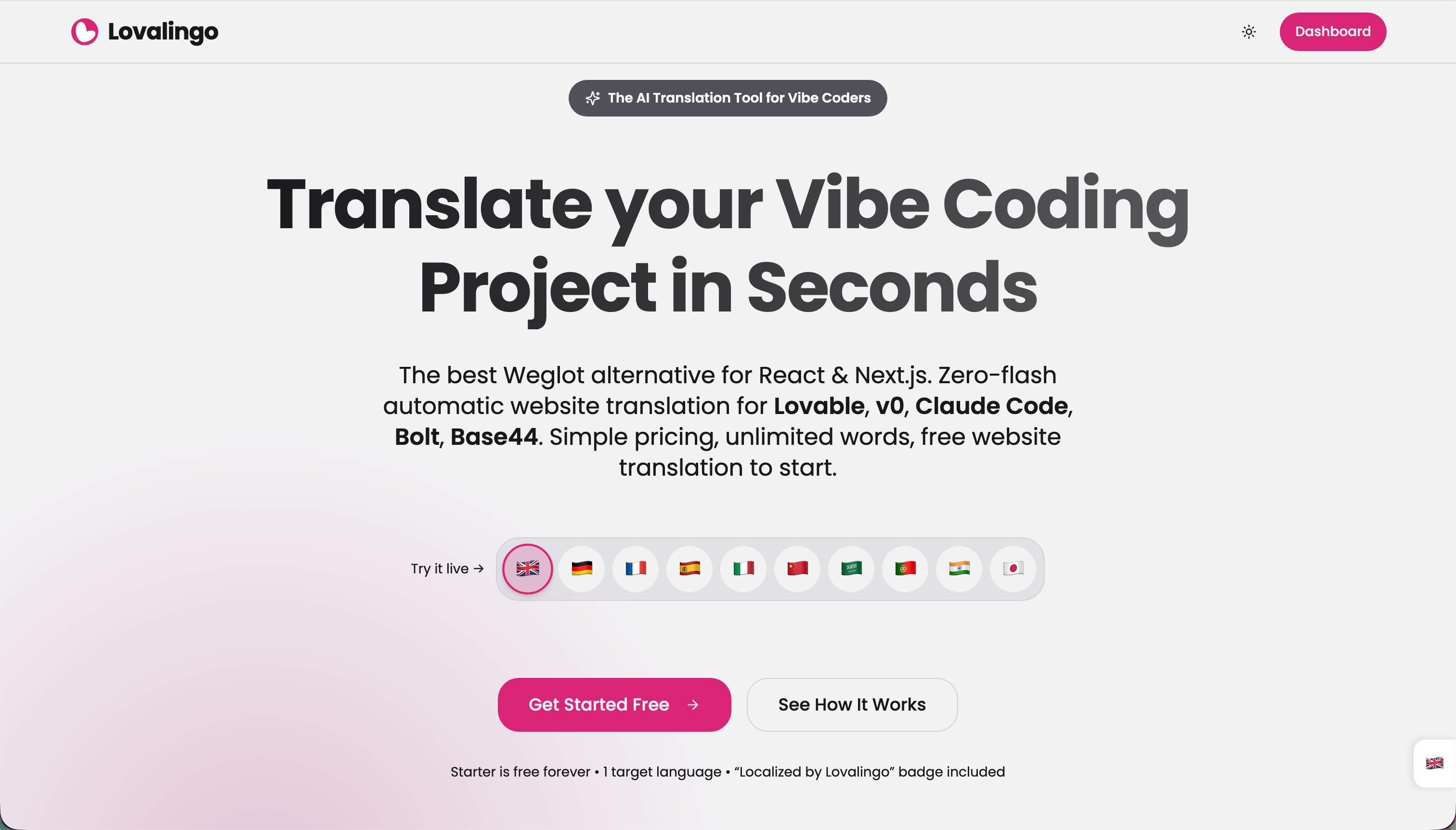 Lovalingo eliminates i18n maintenance for the AI era. Traditional translation means manual JSON strings, broken layouts, and SEO headaches. With tools like Lovable, LLMs often "get lazy" and skip bulk translations, leaving your global growth stalled. Lovalingo fixes this by replacing legacy i18n with automated, render-native translation. Key Benefits: Native SEO: Automatically generates multilingual sitemaps, hreflang tags, and meta descriptions. Get indexed globally on day one. Zero-Flash UI: Unlike Weglot, we don't "hack" the DOM post-load. Translation happens during the React render - no flickering, no layout shifts. Vibe-Coding Ready: 100% compatible with Lovable, Bolt, and v0. Add one script, and your app scales to any language instantly. Zero Maintenance: No JSON files to manage. Auto-detects routes and updates content in real-time. Use Cases: SaaS founders scaling to international markets, agencies building on Lovable, and devs who hate manual i18n.