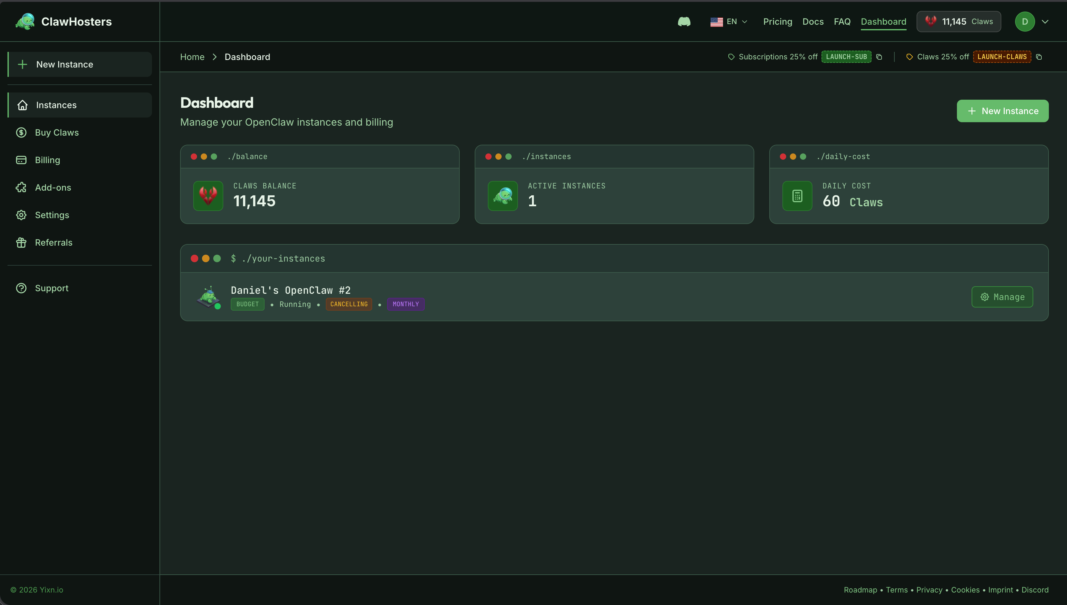 Managed OpenClaw hosting for people who want a personal AI assistant without the server headaches. OpenClaw is the fastest-growing open-source project on GitHub (145K+ stars). But self-hosting means Docker, VPS configs, port forwarding, SSL certs, and midnight debugging sessions. ClawHosters handles all that. You get a running instance in under 60 seconds. What's included: • Free AI (Gemini Flash or DeepSeek) on all plans • Telegram, WhatsApp, Discord, Slack support • Full SSH access if you want to tinker • Auto-updates and backups • BYOK if you want Claude or GPT-4 Pricing: €19/mo (Budget) | €35/mo (Balanced) | €59/mo (Pro) Built by a solo dev who got tired of being unpaid tech support for friends running OpenClaw.