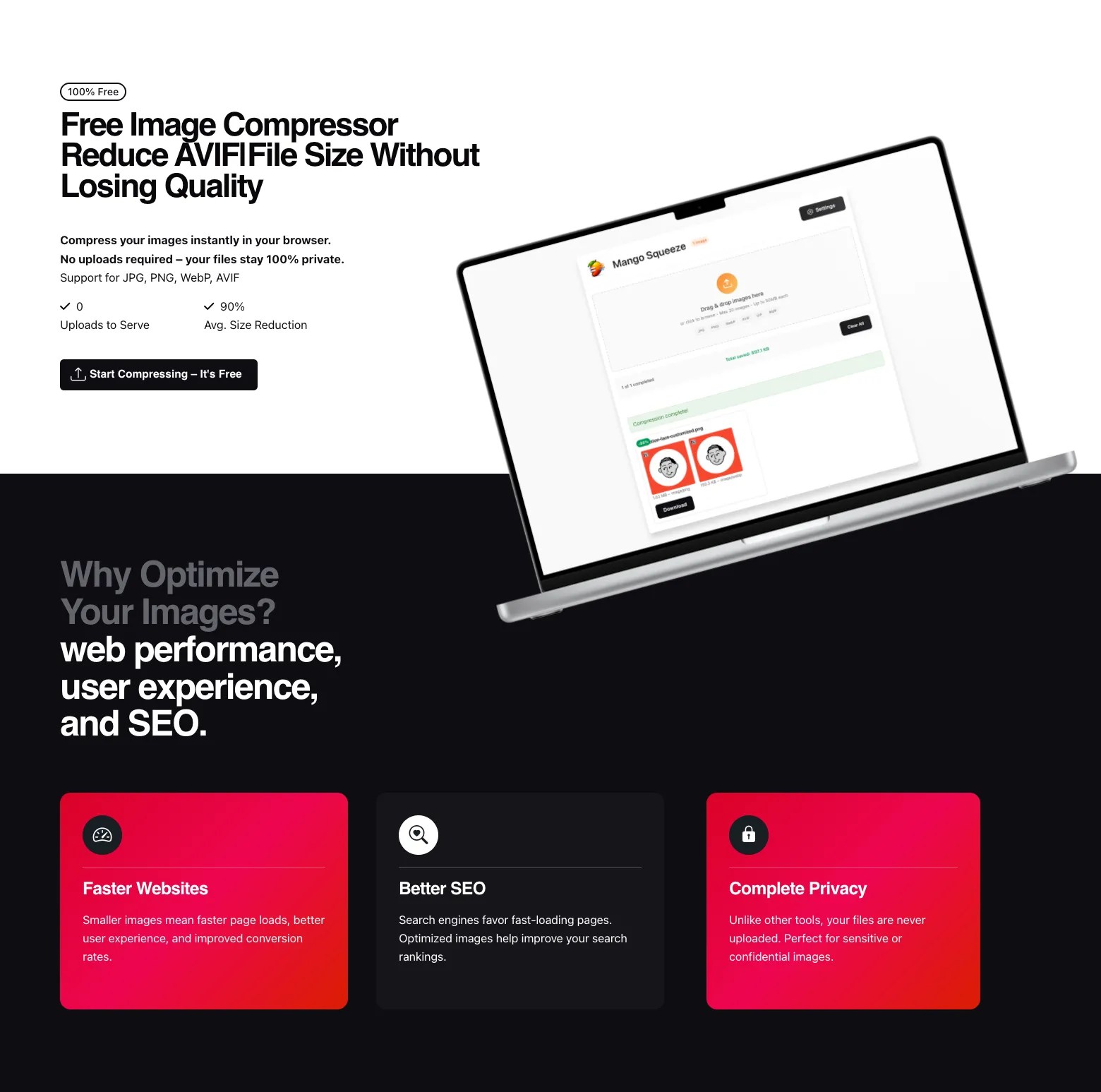 You can compress your images online for free with Mango Squeeze. This tool allows you to reduce file sizes by up to 90% while maintaining high visual quality. It is a fast and secure browser-based tool that works locally, meaning you don't have to worry about uploads or sign-ups. You can optimize your images quickly and efficiently for various web and design needs.