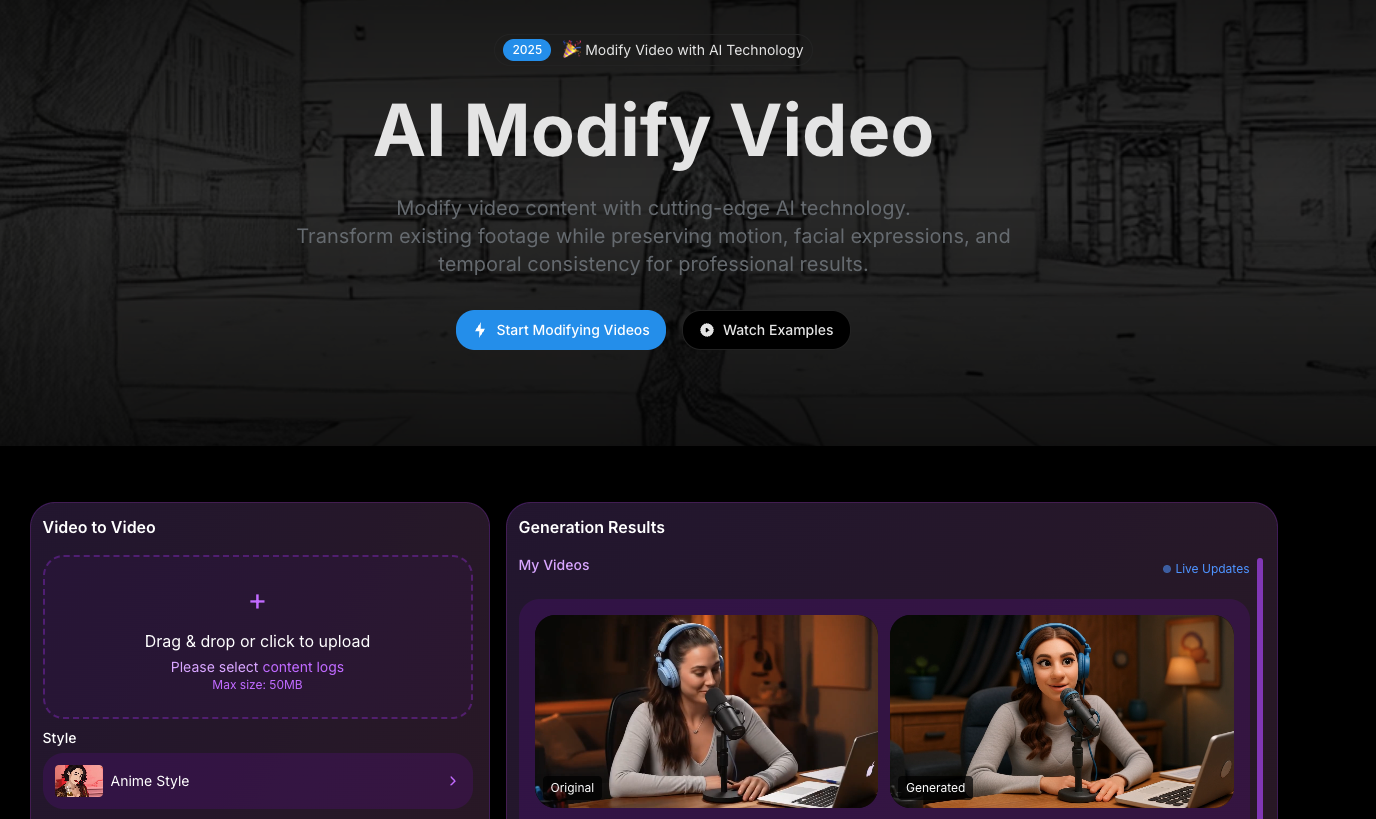 AI modify video tool preserves motion and facial expressions while transforming backgrounds, styles, and environments. Professional video transformation.