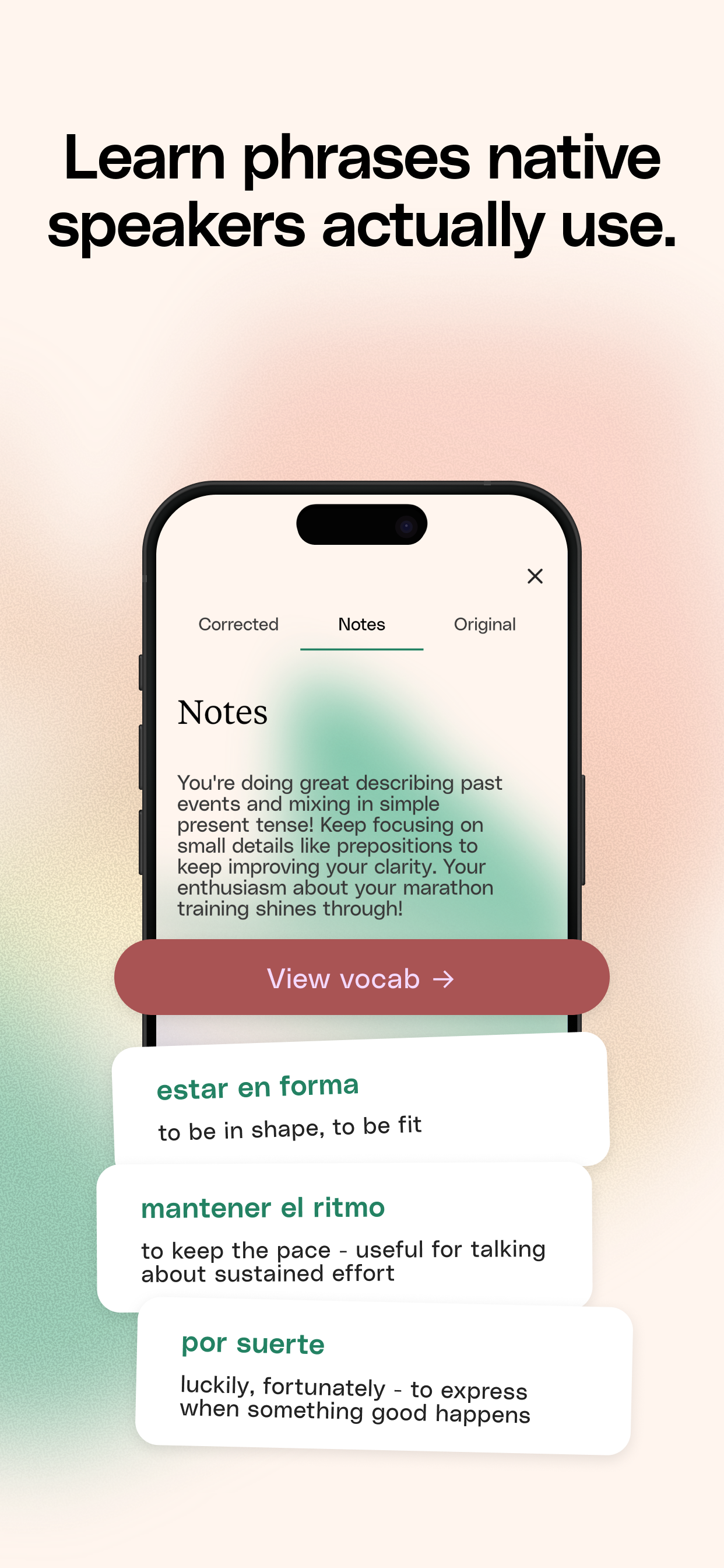 Learn a language by writing your life. A calm journaling app for language learners with AI corrections, natural phrasing upgrades, and progress insights. Write daily entries in a new language, get clear corrections, and build vocabulary from your own words.