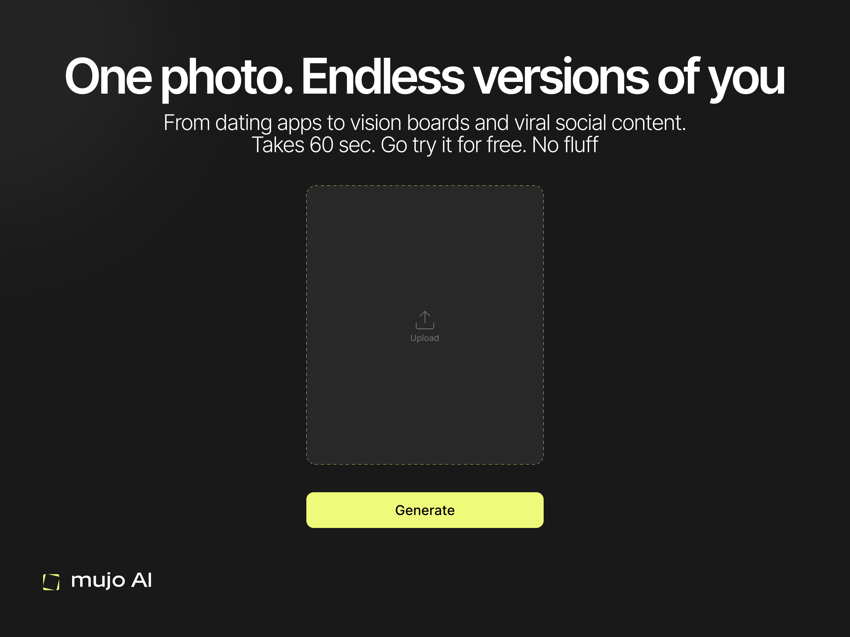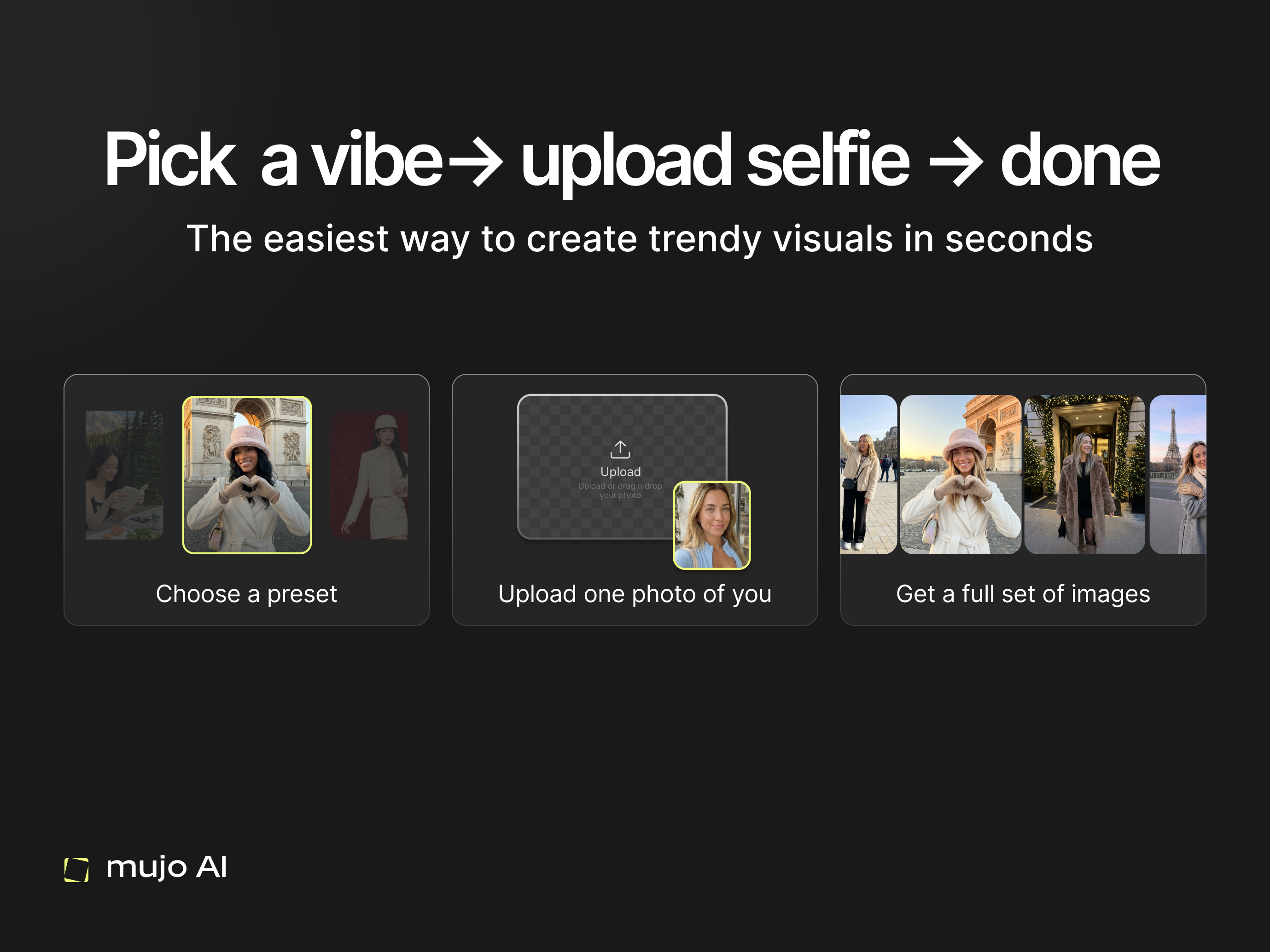 MUJO AI Photoshoot turns one selfie into a full set of stylish, trendy images — designed to look native on social and irresistible to share. Browse curated aesthetics, generate a consistent pack in mi