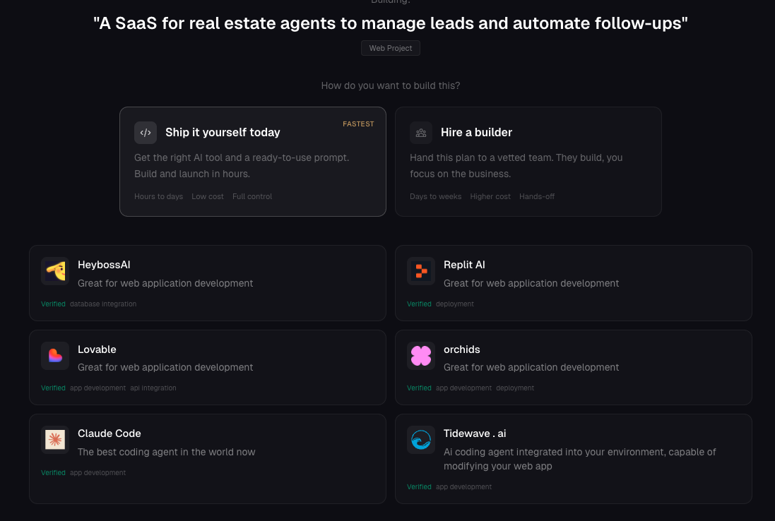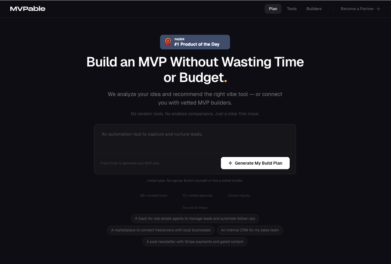 MVPable is a decision engine for founders who want to build an MVP the smart way. Instead of testing random tools or hiring the wrong team, you describe your idea and MVPable recommends the right first move: – The best vibe tool (Lovable, Replit, Bolt, etc.) if you can build it yourself – Or vetted MVP builders if you need execution support We remove cognitive overload from early-stage product decisions. No endless comparisons. No generic advice. Just a clear path to ship. Whether you're building a SaaS, marketplace, AI product, internal tool, or mobile app, MVPable helps you start with the option that fits your product, stage, and technical depth. Instant plan. No signup required.