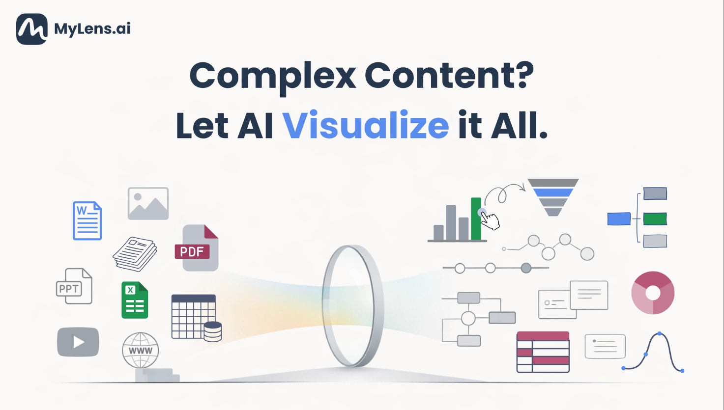 MyLens AI transforms all your sources (docs, files, videos) into **interactive visuals & diagrams**—like mind maps, timelines, flowcharts, tables, and more—so you can easily understand what matters mo