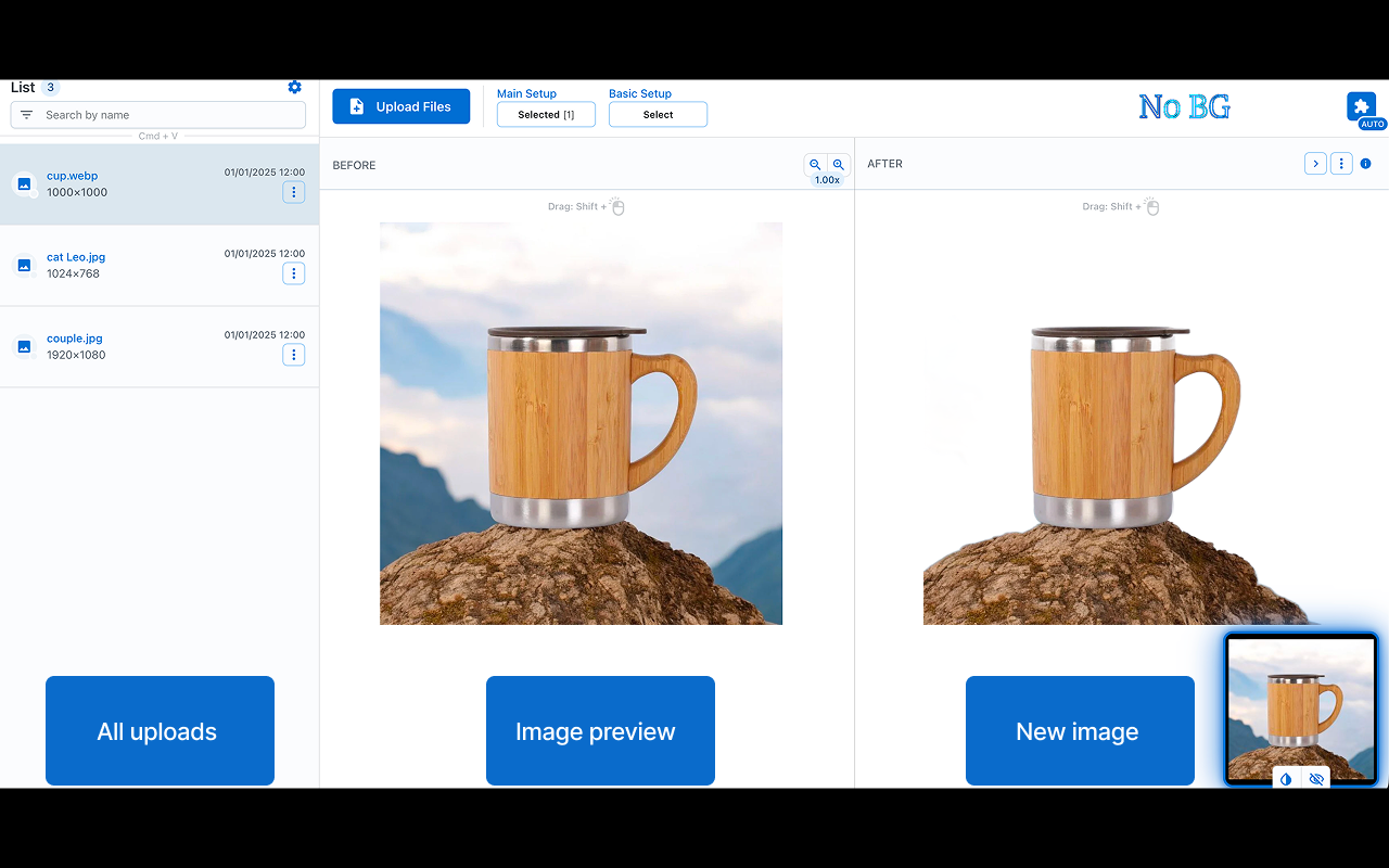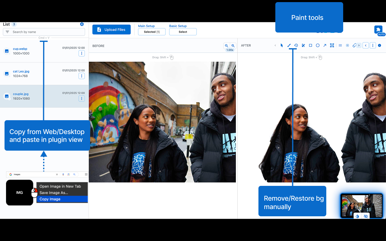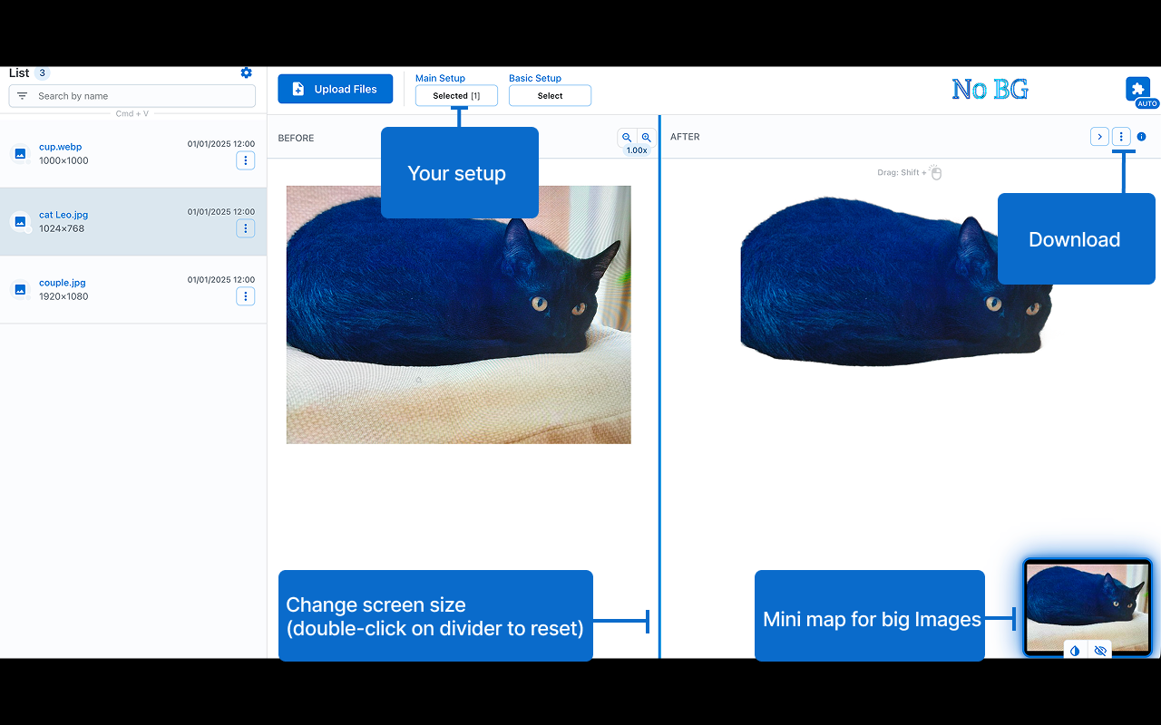 No BG improves your workflow by instantly removing backgrounds from images with high accuracy, and enabling secure downloads, ensuring your data stays private and offline. Features: • ⚡ Performance: processes images quickly with no upload delays (your files never leave your device). • 🎯 Precision: delivers clean, high-quality cutouts with smart edge detection. • 🔒 Offline Functionality: runs fully offline to ensure complete data privacy. • 🎨 Edit: paint tools where you can remove/restore bg manually. • ✨ Extra Options: output size control, watermarking (image/signature), metadata handling, and format selection. Shortcuts: • Paste files from your clipboard for processing: Ctrl/Cmd + V • Copy the modified selection to your clipboard: Ctrl/Cmd + Shift + C Note: compatibility may vary across devices 😢.