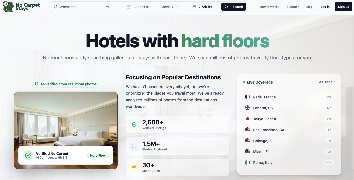 After too many hotel stays spent zooming into photos to check the floors, I built a tool to save time. Launching No Carpet Stays feels like turning a personal frustration into something useful.