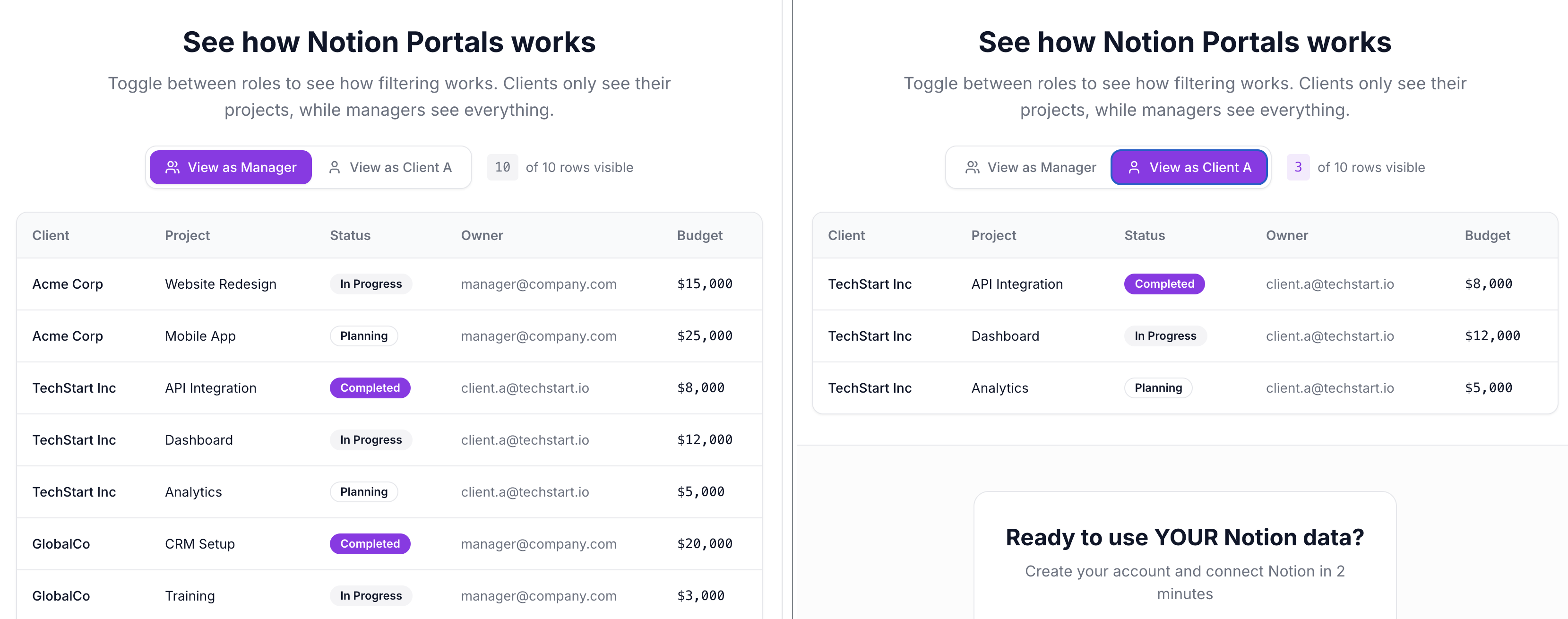 Notion Portals allows you to share Notion databases securely with clients without them needing their own Notion account. You can maintain control over your data using row-level filtering and column hi