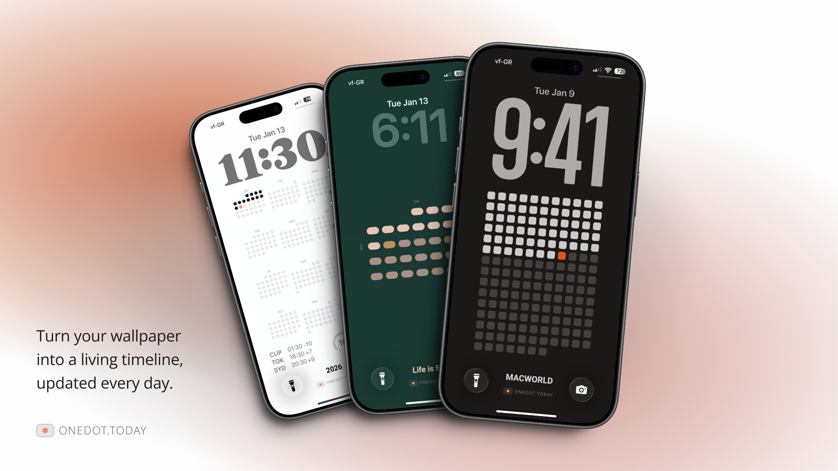 Transform time into visual art. Generate custom high-resolution wallpapers for memento mori and productivity tracking. One dot per day, visualized beautifully. One Dot turns your wallpaper into a daily-updating view of time. Instead of a static background, it shows days, weeks, months, or quarters as they pass. Built for iOS using Shortcuts, it updates automatically once per day. A simple way to keep time visible without notifications or tracking.