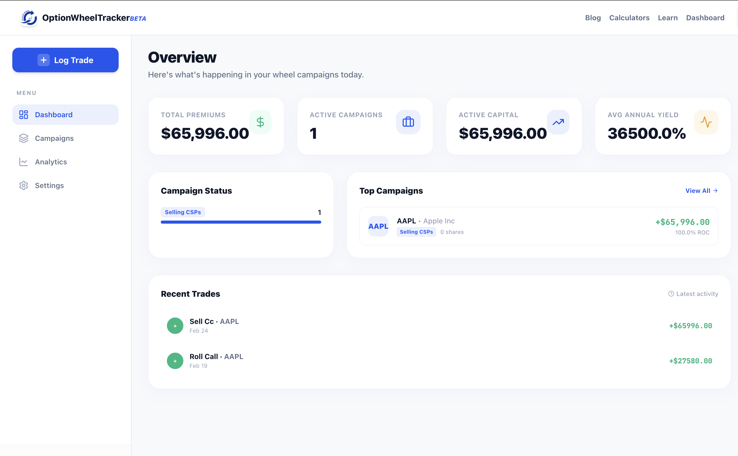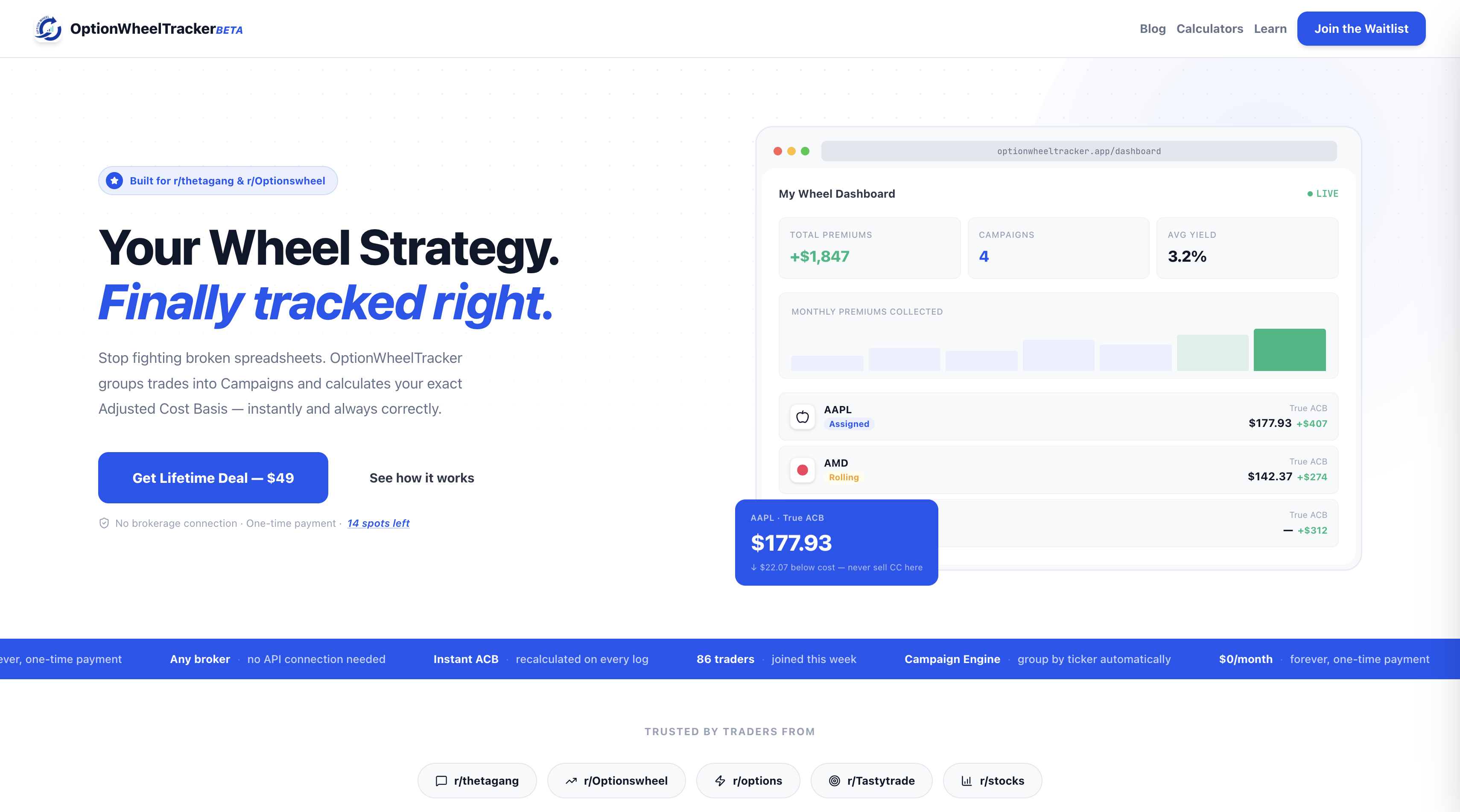 The Wheel Strategy is powerful. Tracking it is a nightmare. One roll. One assignment. Suddenly your spreadsheet returns #REF! and you're flying blind on every trade that follows. OptionWheelTracker fixes that. It groups every trade — CSP, roll, assignment, covered call — into Campaigns by ticker and recalculates your true Adjusted Cost Basis instantly on every log. Know your exact break-even. Never sell a covered call below it again. What makes it different: No brokerage connection (zero security risk, works with any broker). One-time payment — no monthly subscription eating your premiums. Mobile-first so you can log a filled order in 5 seconds from your phone. Built specifically for the Wheel — not a generic options tool with Wheel features bolted on.