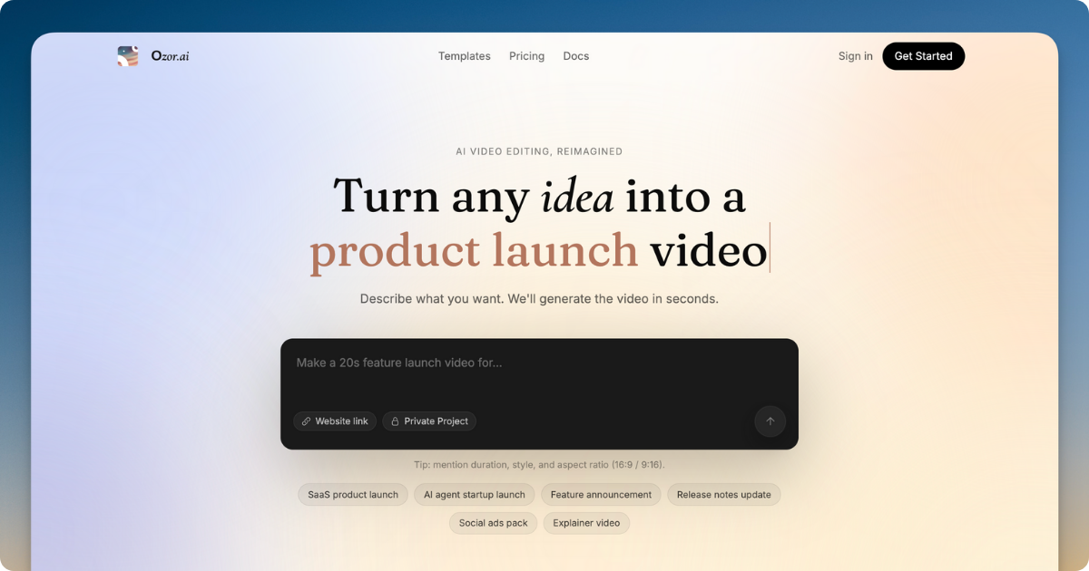 You can turn any idea into a professional launch video in seconds. Ozor is built specifically for startups and creators who need high-quality marketing content without the traditional production time.