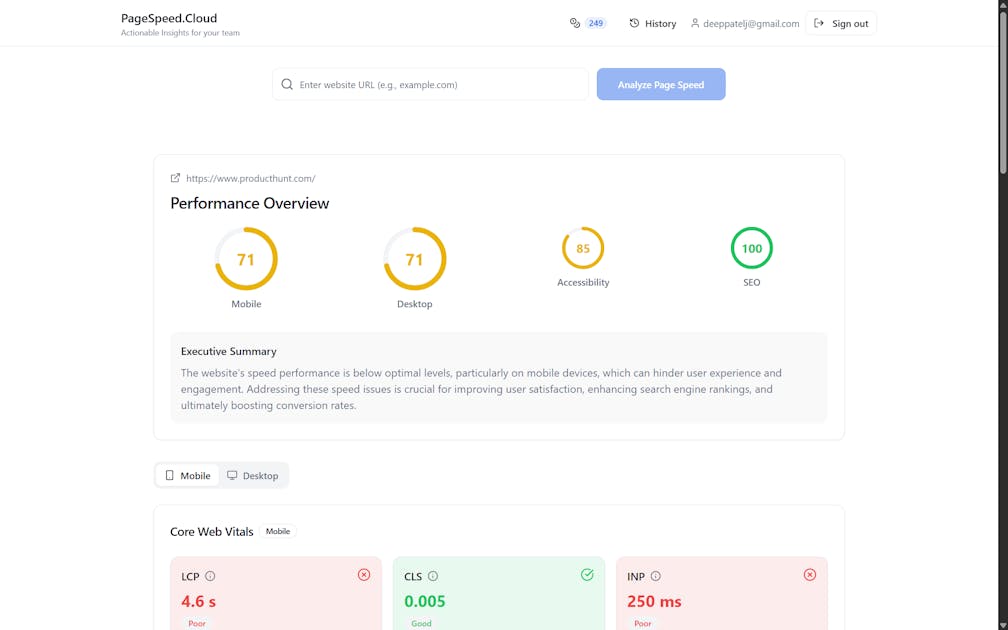 PageSpeed.cloud helps you turn Google PageSpeed data into clear, implementation-ready fixes. You can analyze your website performance, Core Web Vitals, and SEO in minutes to ensure your site is optimized for both users and search engines. This tool provides actionable insights that allow your team to identify and solve performance bottlenecks efficiently, improving overall speed and search visibility.