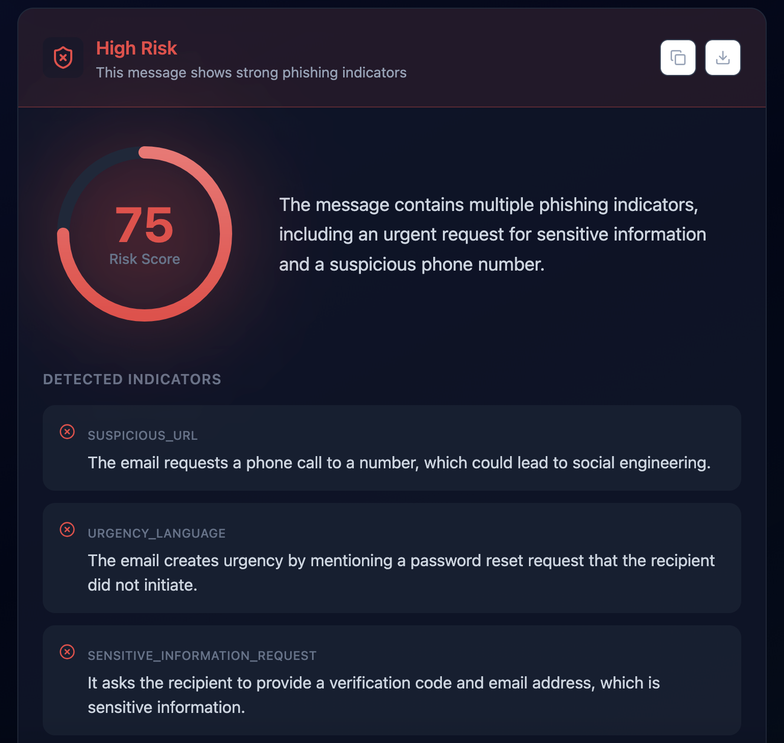 PhishGlass helps you stay safe online by providing a quick and efficient way to assess phishing risks. Whether you are checking an email, an SMS, or a direct message, you can use PhishGlass to get a clear risk score. This tool allows you to identify potential threats instantly and provides actionable tips to help you navigate your digital communications with confidence. By using PhishGlass, you can better protect your personal information and improve your overall cybersecurity posture. Just copy-paste a screenshot, and let PhishGlass evaluate it!