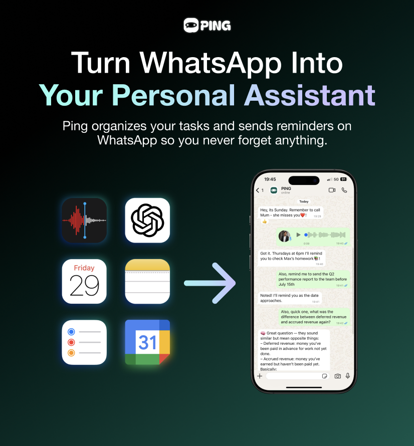 Ping.me is a personal WhatsApp-based reminder assistant built for ADHD. It helps you stay organized and on track through smart, timely messages—without installing another app or dealing with digital clutter. What Ping.me does: - Unlimited memory: Ping remembers things about you, so you can ask whenever you forget - Smart reminders: notifications only when they actually matter - Custom routines: e.g. “Send me a market update every morning” - Built-in research: powered by ChatGPT-5 and Perplexity - ADHD-first by design: minimal friction, maximum follow-through