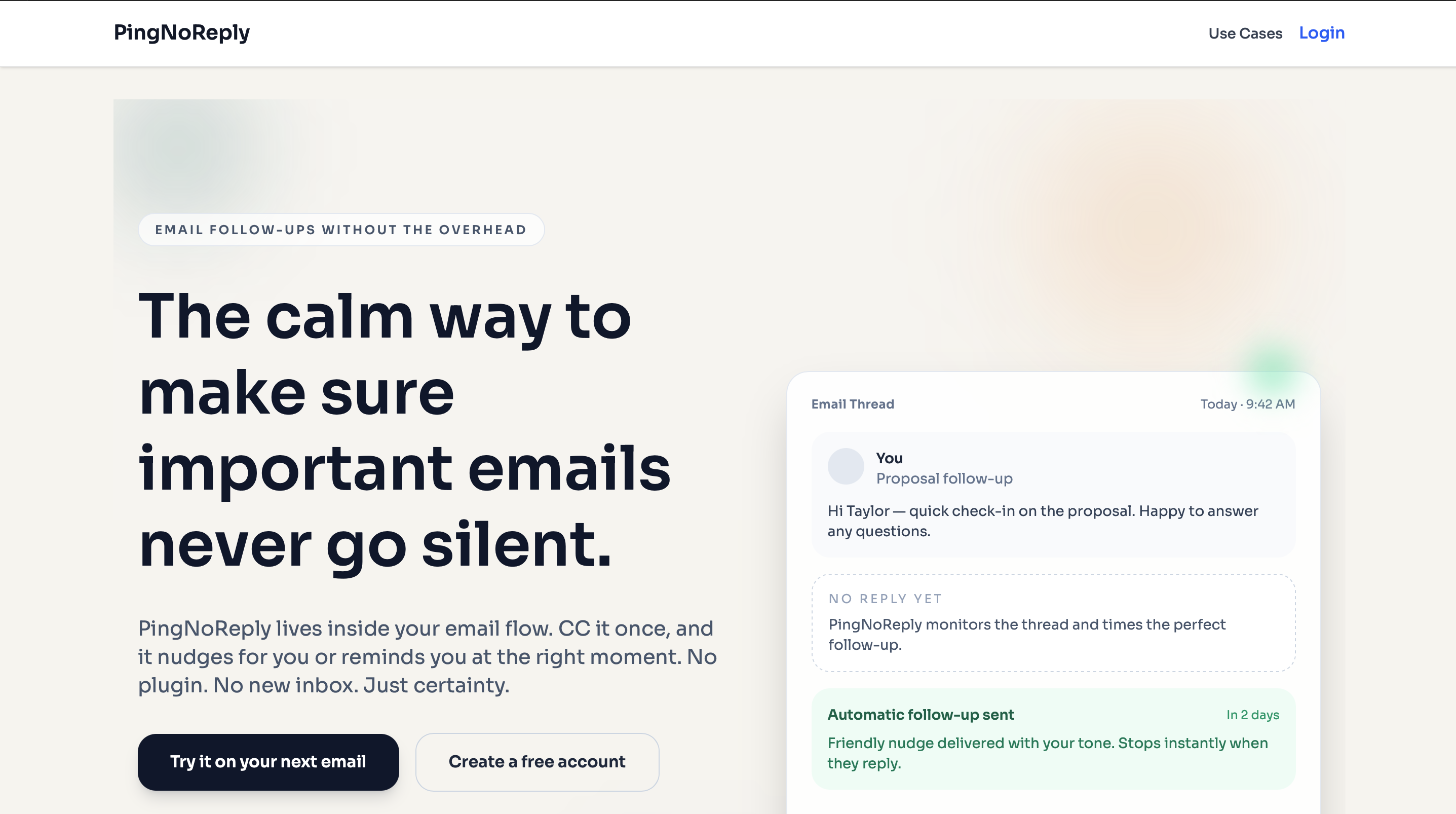 PingNoReply helps you ensure no important email goes unanswered. You can automatically follow up on emails using AI or receive reminders to do it yourself. There is no complex setup required; you simply CC the service on your outgoing emails to trigger the system. It streamlines your communication workflow by managing the waiting period for you and ensuring your message stays at the top of the recipient's inbox.
