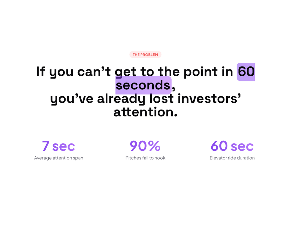 PitchMode is designed to help you refine and deliver your elevator pitch with confidence. Train to pitch your product so investors get it — in the time it takes to ride an elevator. Press record. Speak for 60 seconds. Get sharp, investor-style feedback moments later.
