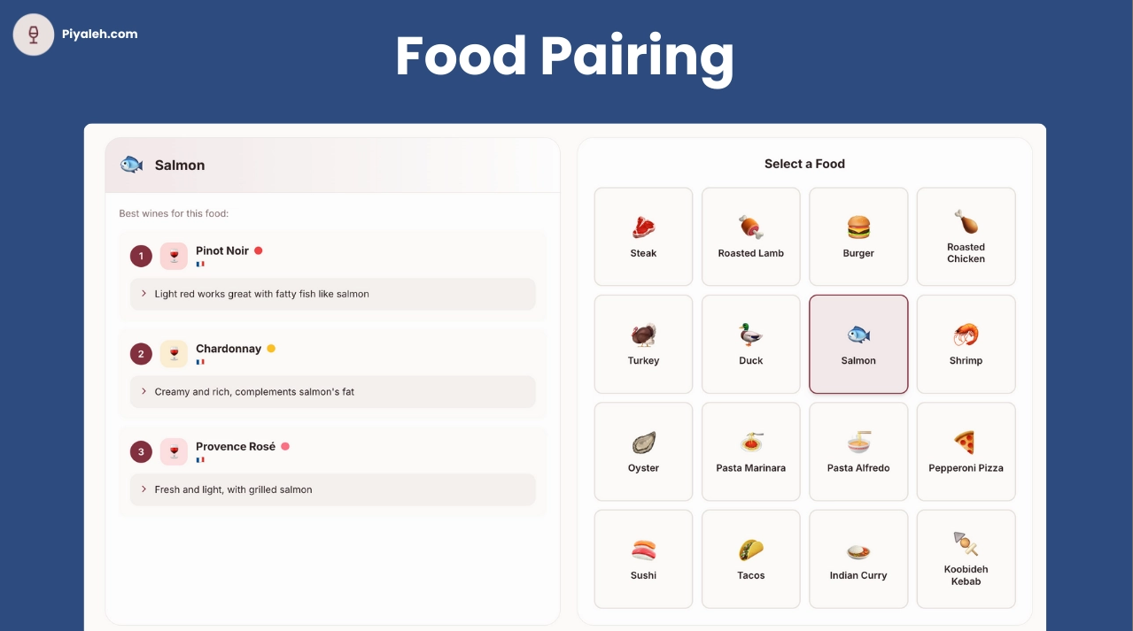 Piyaleh is a Free AI wine pairing and learning platform that helps you discover the right wine for real-life moments. Share what you’re enjoying (a dish, a café vibe, a song, a movie, a place, or even a photo) and get wine suggestions that fit instantly. Then explore the story behind each match through interactive, visual sections like wine profiles, taste & aroma exploration, and pairing guides for food, cheese, olives, and even the world map.