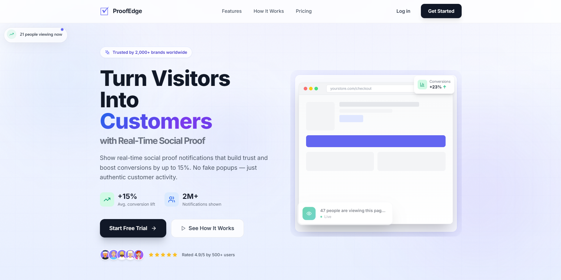 Boost conversions by up to 15% with ProofEdge — the lightweight social proof widget that displays real-time purchases, signups, and visitor activity. No fake popups, just authentic proof. Free plan available. Setup in 2 minutes.