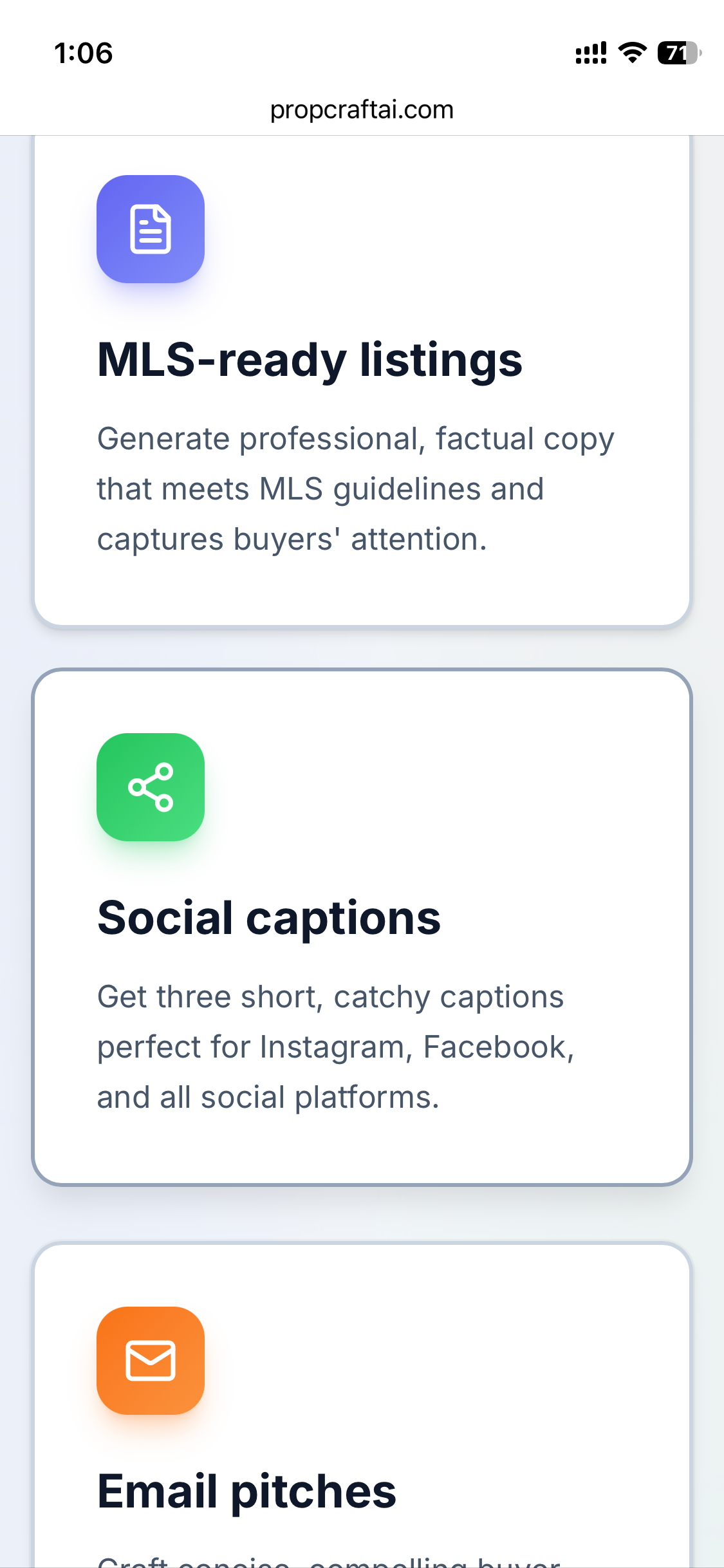 PropCraft AI serves as your dedicated real estate AI assistant, allowing you to focus on closing deals while it handles the content creation. You can generate professional, MLS-ready listing copy, engaging social media captions, and persuasive buyer outreach emails in just seconds. This tool helps you streamline your marketing workflow by taking the manual effort out of writing, ensuring your property descriptions and communications are always high-quality and effective.
