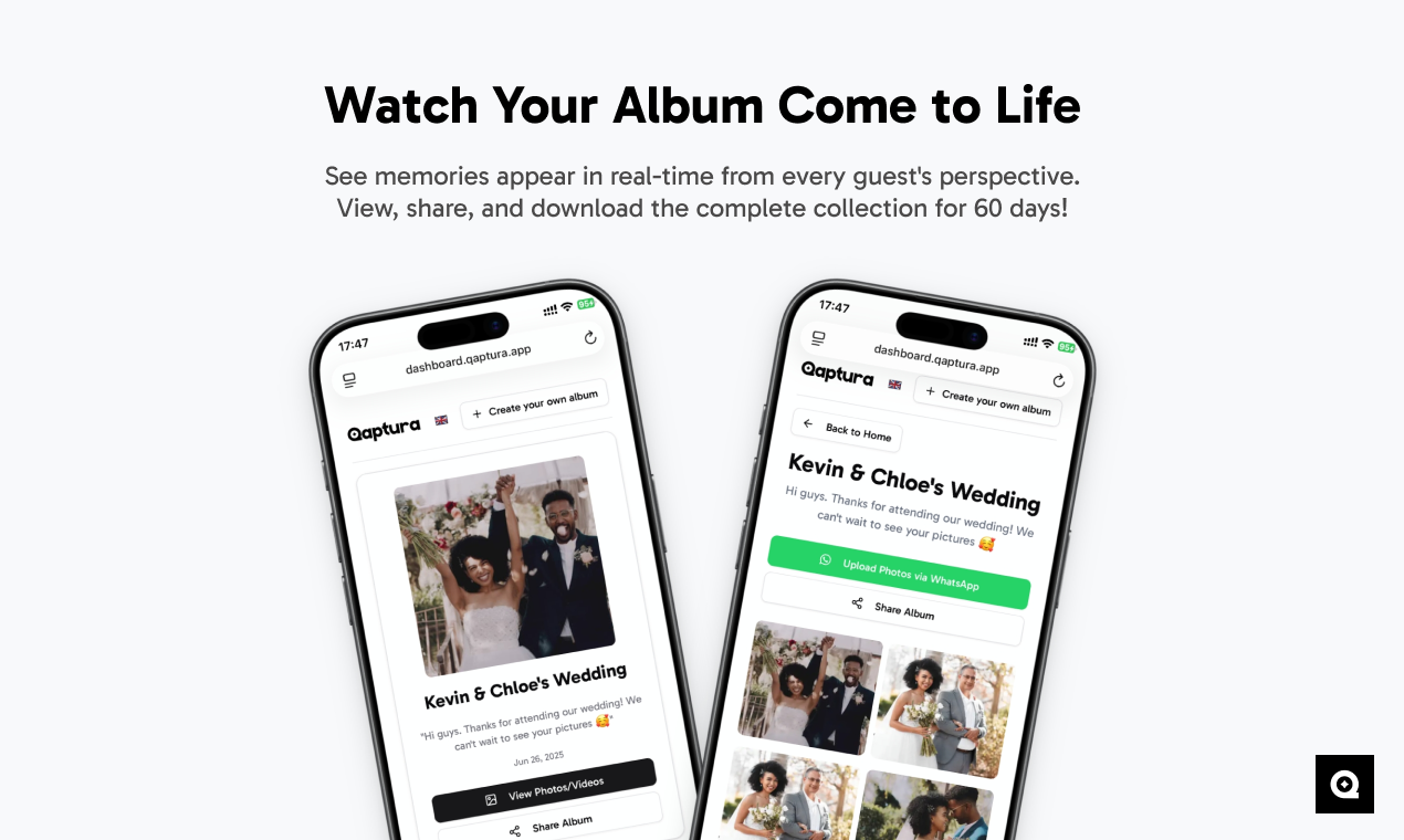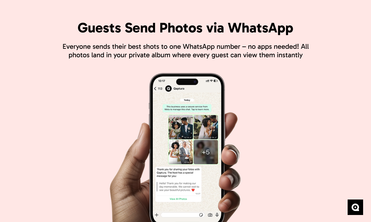 Remember the last wedding, party, or corporate event you went to? How many amazing, candid photos and videos were lost on dozens of different phones? We’ve all been there, begging guests to "please send me those photos!" It’s a shared, live event album that anyone can contribute to, and it works 100% through WhatsApp. There is no app to download, no account to create, and no complicated instructions. Guests already know exactly how to use it.