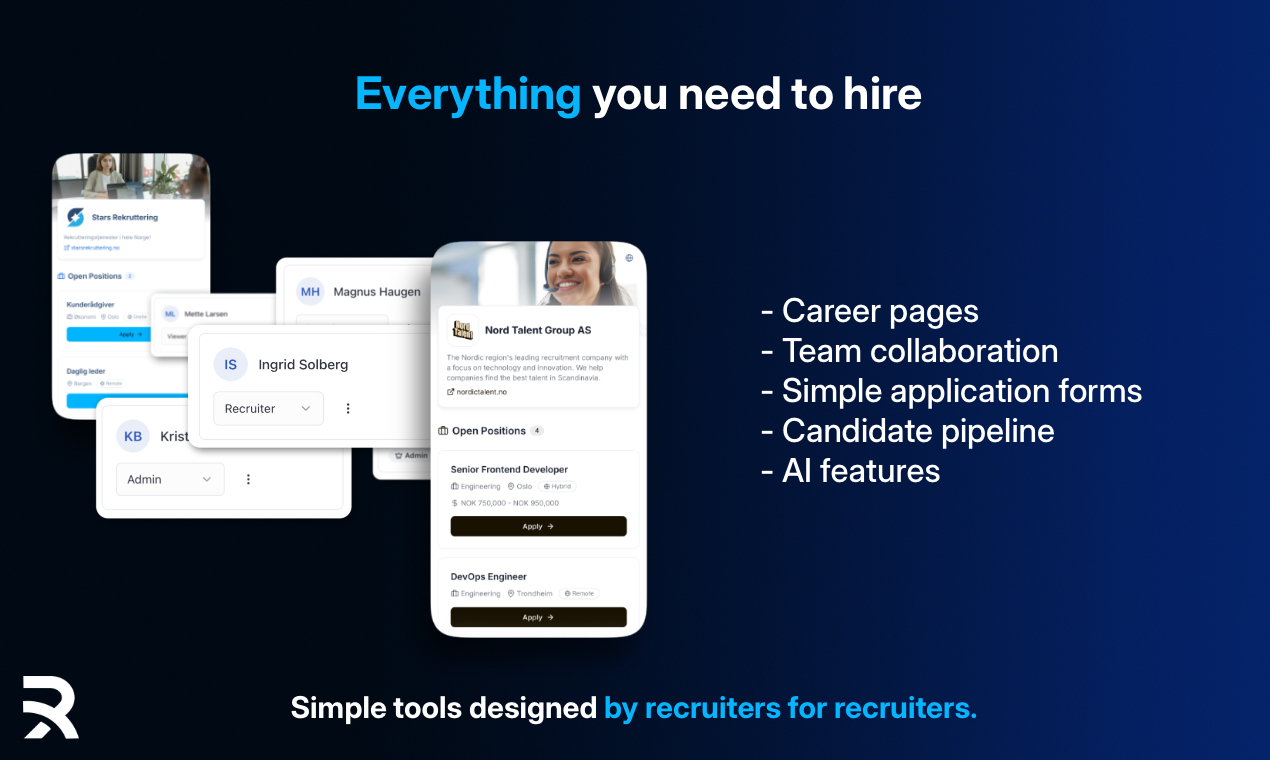 Recy is a free recruitment system built for small and medium sized businesses that want a simple and affordable way to hire. Create branded career pages, manage candidates, and organize your hiring pi
