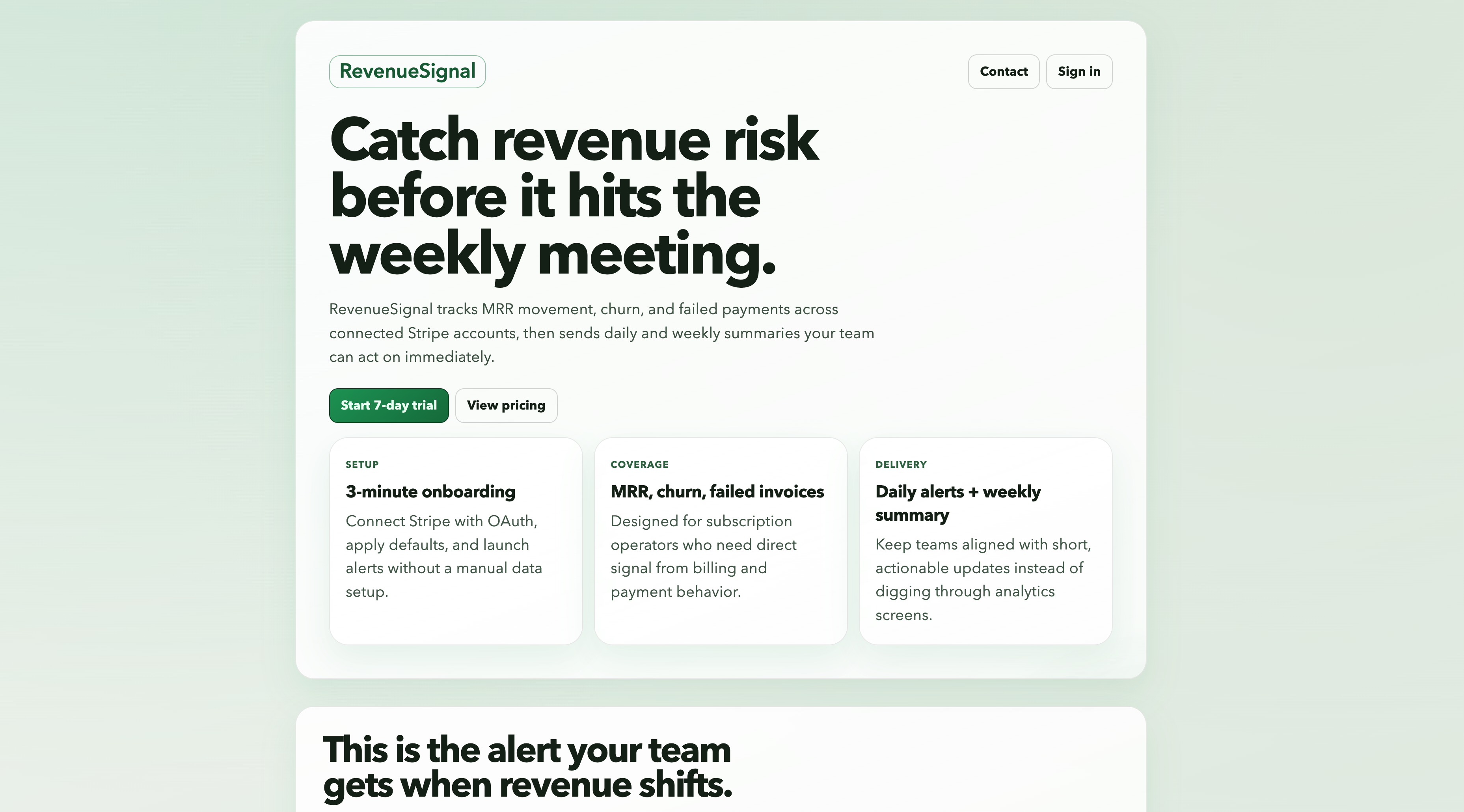 RevenueSignal helps you stay on top of your financial health by monitoring Stripe MRR, churn, and failed payments in one centralized dashboard. You can receive daily alerts and weekly summaries to ens