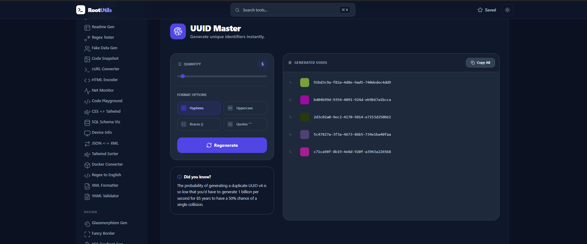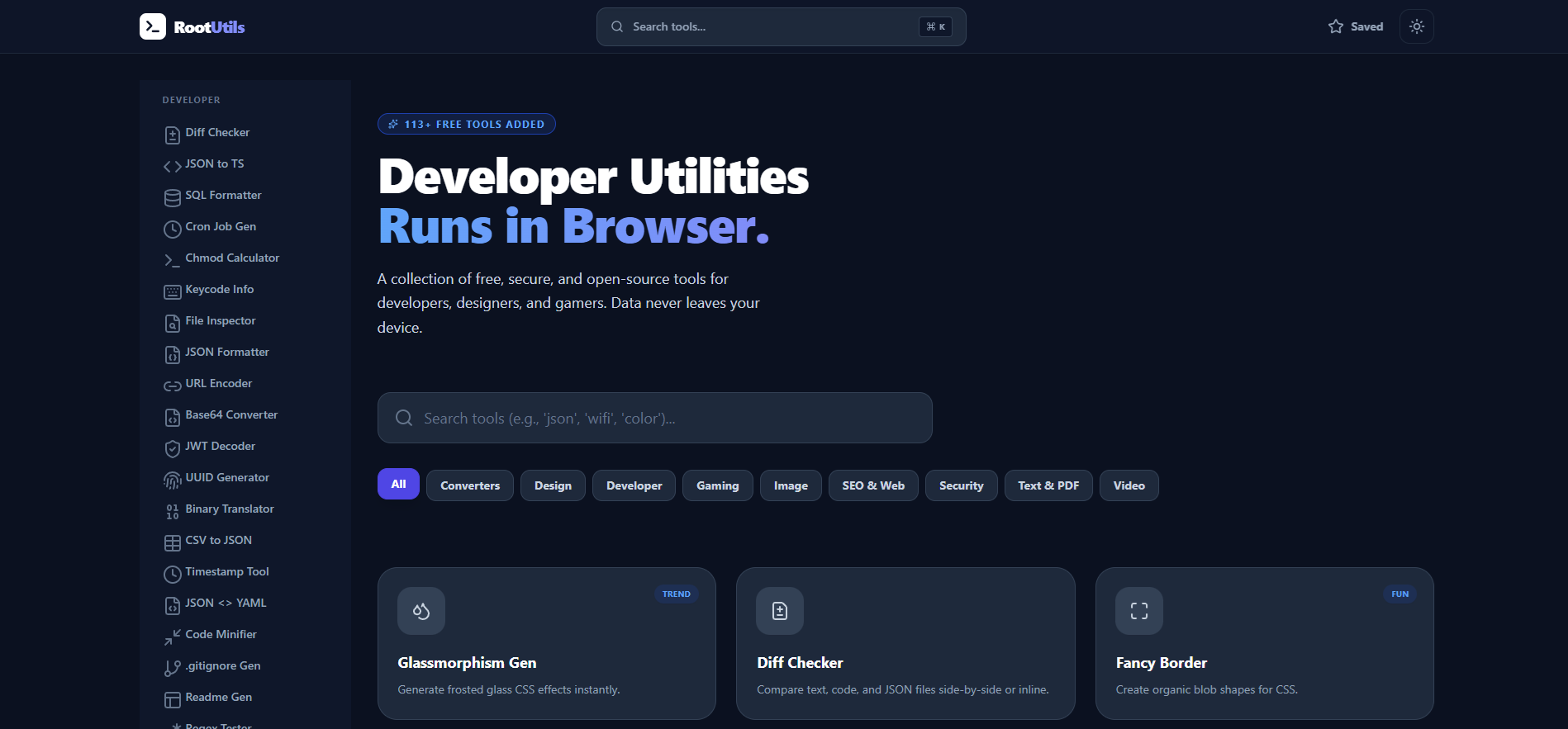 RootUtils offers a comprehensive collection of over 110 free, privacy-focused developer tools and utilities.