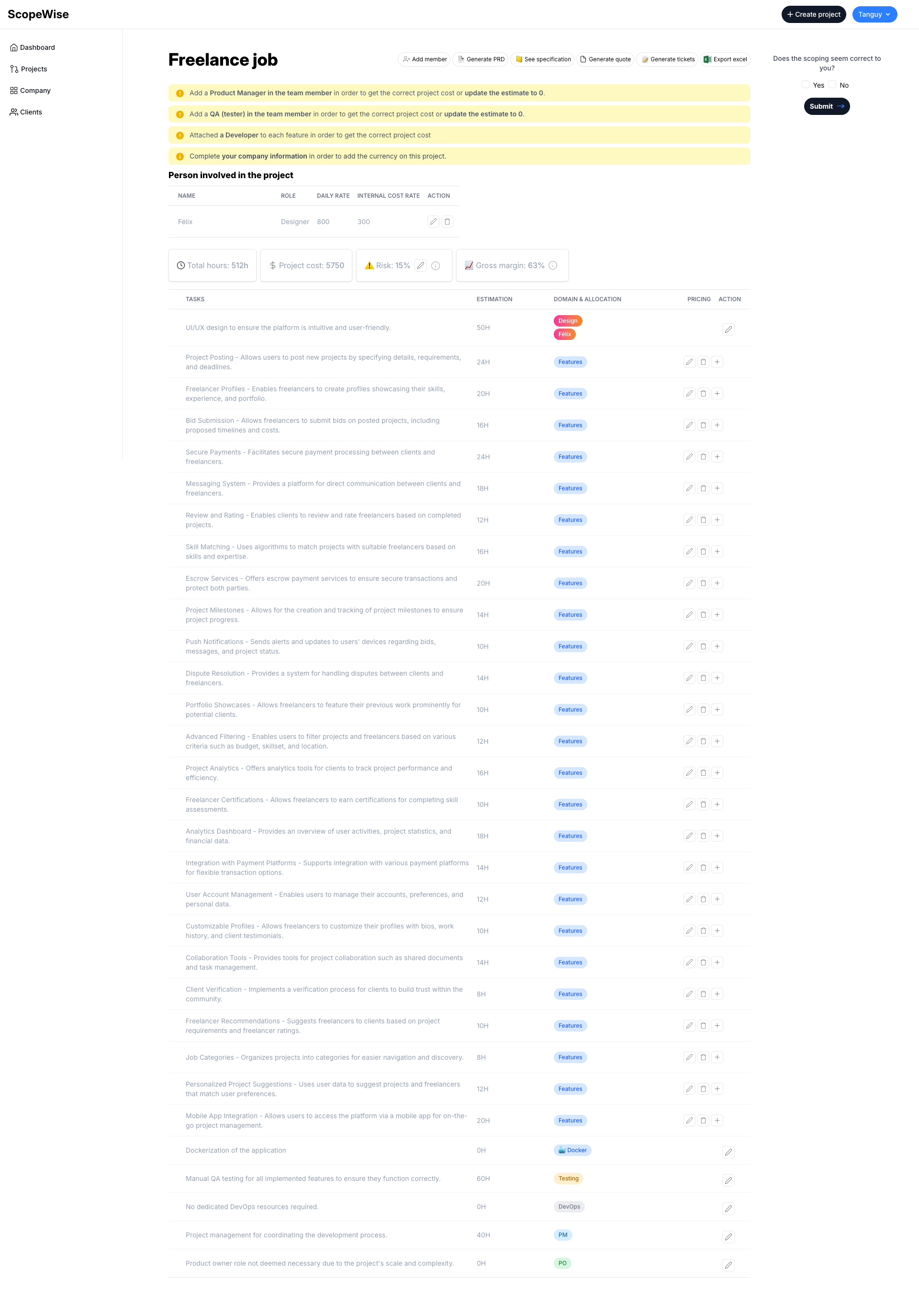 ScopeWise provides you with an AI-powered platform designed to streamline the project scoping process. You can generate professional estimates and quotes for IT projects efficiently, helping you save time and improve accuracy in your proposals. This tool allows you to transform requirements into detailed project breakdowns using artificial intelligence.